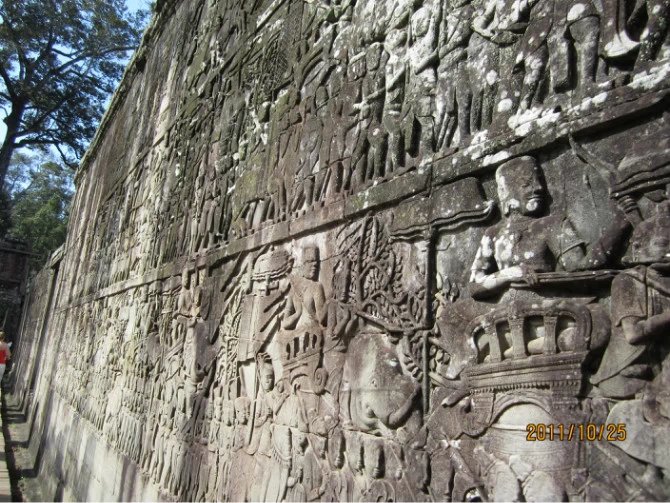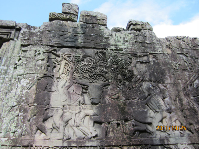 巴戎寺回廊上的壁画被人称作“不可不看”,内容十分丰富,更可贵的是与吴哥寺不同,巴戎寺的壁画并非一味的史诗与神话内容,还有大量的以现实生活为题材的壁画,从战场厮杀到生产劳动、集市贸易的生活图景应有尽有。