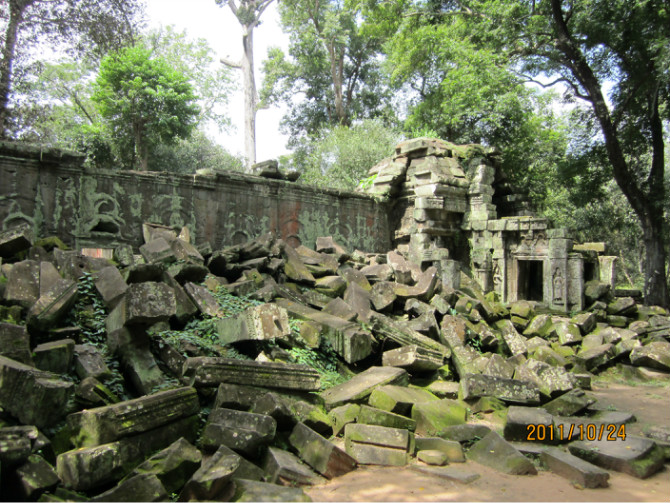 在巴戎寺北面的大门位置,有一大片坍塌的废石堆,不知是门廊还是塔楼的遗址倒塌造成的,还是修缮时被统一放置在此的。在雨林下面隐藏了将近一千年的石头,一旦不在原来的位置,没有那些撼人心魄的雕刻,顿时就露出了残破衰朽的面目,岁月和环境造成的黑色痕迹和白色斑痕如同丑陋的老年斑一样,昭示着惨不忍睹的真相。