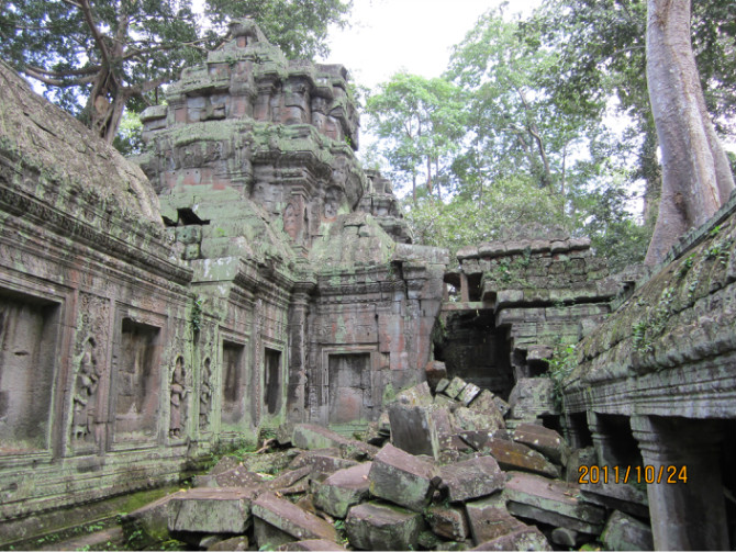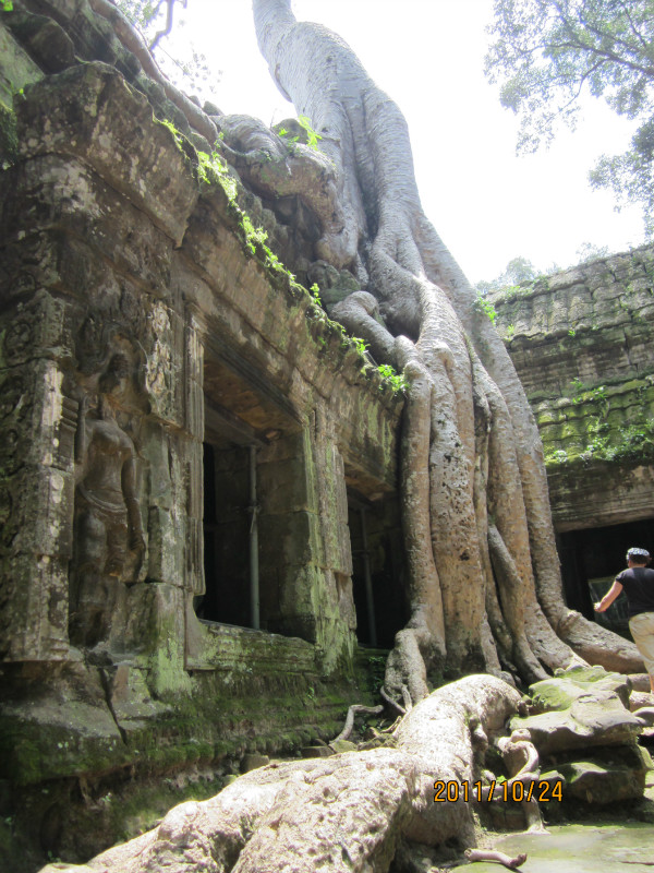 据说崩密列这个名字的意思是“荷花池”,可是呈现在眼前的景象完全让人无法联想到如此优美的词语——在废弃的庭院和塔楼之间,树木草丛茂密地生长着,很多巨大的树木甚至直接生长在屋顶上——丝毫没有夸张,树木纠结狰狞的根系裸露在空中,密密麻麻爬满了整个建筑(可能是宫殿,塔楼或回廊的任意一处),再狠狠的扎入地底。
