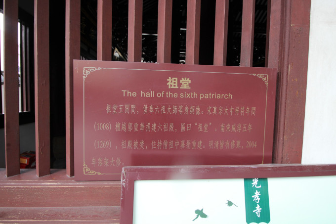 光孝寺六祖殿,建于北宋真宗年间,最初建立于宋大中祥符年间(1008年),明清时期又重建。六祖惠能(638—713年),号大鉴禅师,祖籍河北,俗姓卢,生于广东新兴。幼丧父,粥薪事母,偶闻他人诵《金刚经》心有所悟,遂萌出家之志,投湖北黄梅五祖座下求法。作偈“菩提本无树,明镜亦非台,本来无一物,何处惹尘埃。”得五祖弘忍大师印可,亲传衣钵,回岭南后,遇印宗法师于菩提树下出家,受具足戒。他创立的禅宗南派为汉传佛教很大的一个宗派,传播于日本、朝鲜等国,后又传播于欧美。“师肉身不坏,归停曹溪,迄今仍存。”光孝寺为纪念六祖出家之因缘,立殿堂、塑六祖像供海内外佛教届朝拜。是为纪念禅宗六祖惠能而修建。堂内有座六祖惠能的雕像,为近年所雕,神态安祥,表情中充满了智慧。而在六祖堂前还有一只大木鱼,木鱼为佛教法器之一,刳木为鱼形,中凿空洞,扣之作声,鱼头是朝外的。按佛寺里的规定,只有十方丛林才能将鱼头朝外,由此可见光孝寺地位之高。木鱼是和尚们做法事诵经时撞击用的法器。又因为鱼日夜都不会合眼,所以专意用它来警醒众僧,白天黑夜都不要忘记修行,才能"以至于道"。