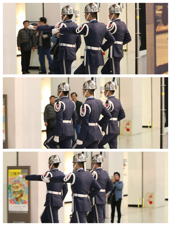 走进展厅,仪仗兵的帅气和正步吸引了大多数游客的目光。