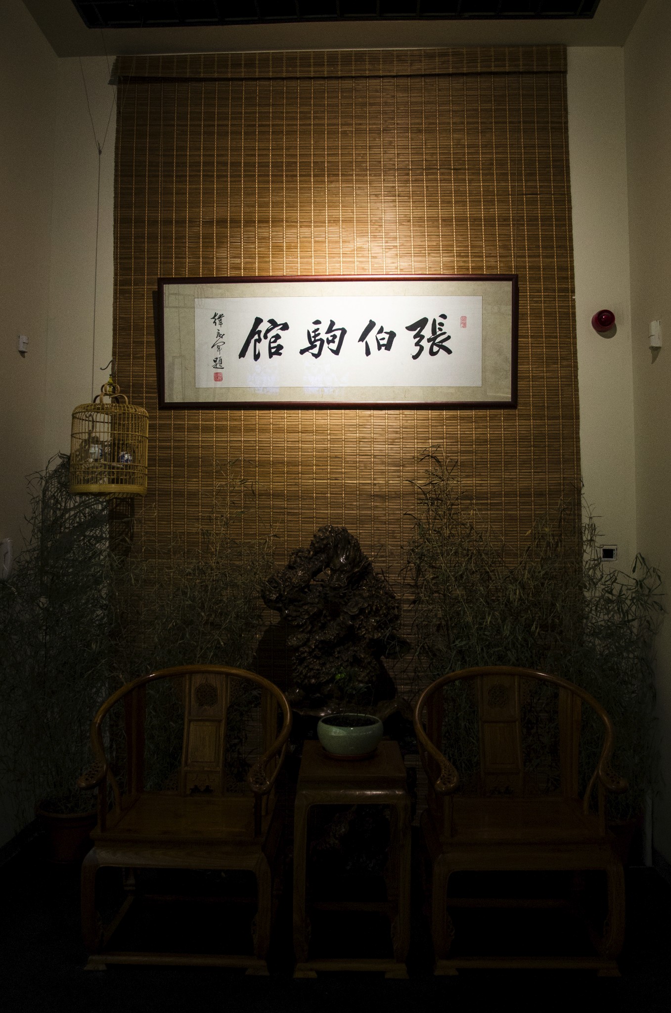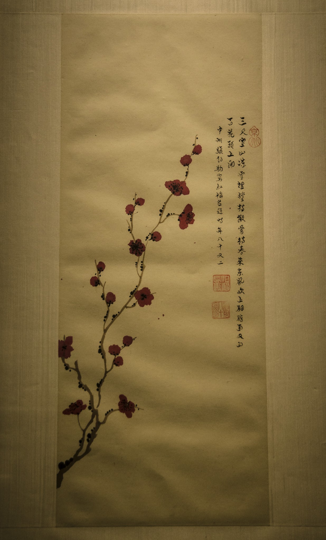 一梅、一兰,一山水,三幅篆字对联,此外无它。