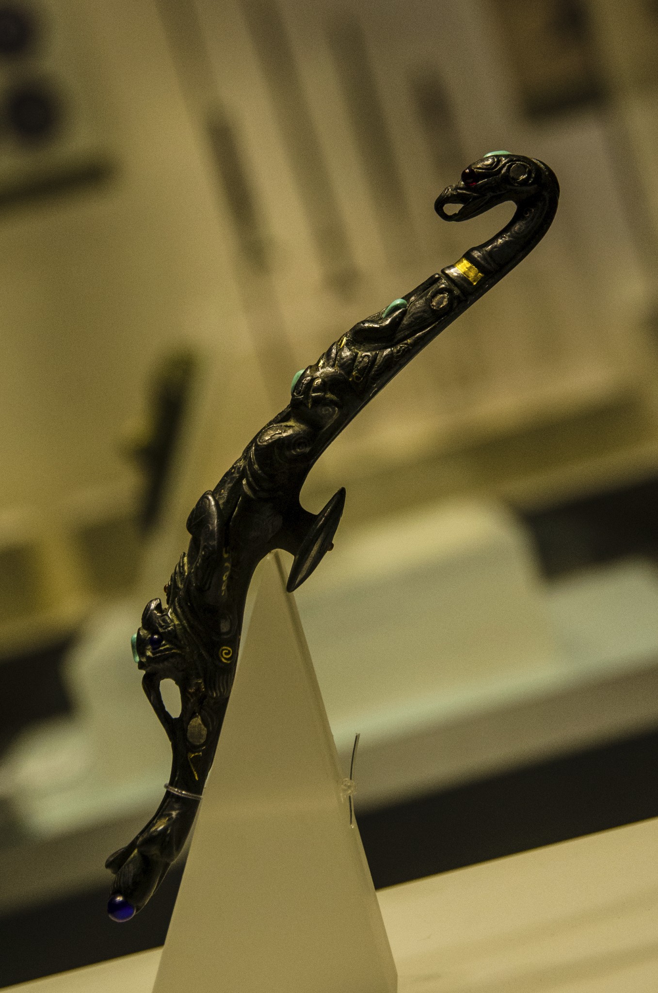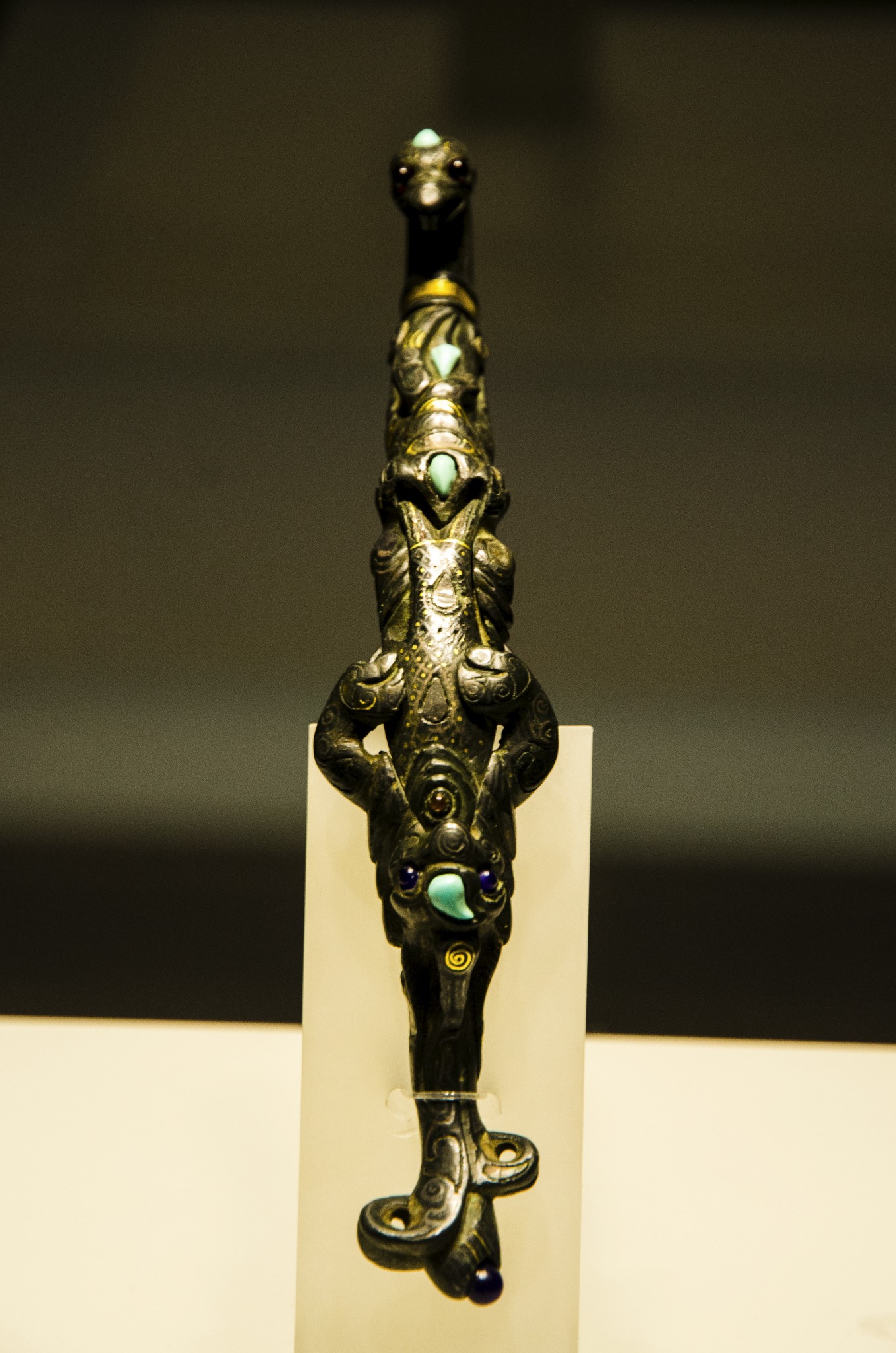 首似鹰,眼嵌黑玉,额嵌绿松石,羽错金银丝。