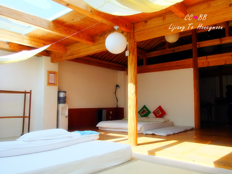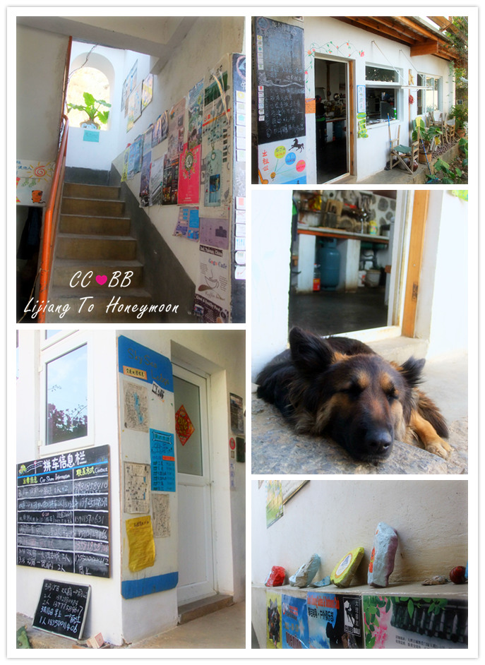 进入主院,正对着是一个厨房,可以在这里订餐,早上也有早餐供应。门口有一只黑贝~懒得要死,一点都不活泼,逗它都不理睬,我们在这两天,它都是图中的姿势,睡~!院子左侧是一个休闲区,有书籍,公用电脑等设施(要脱鞋入内哦!)二楼也是客房,很大,是铺位为主!环境也很不错!
