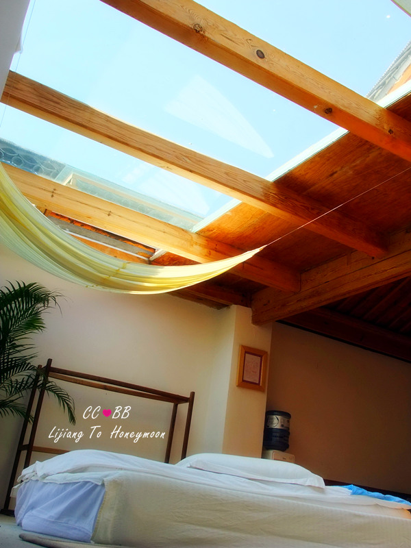 往里看,这就是整体空间啦!右下角露出的一点床,就是主卧床啦!正对着那张床只是看星星用的!可惜的是正对着的落地玻璃,曾经他也是海景窗口,但是现在隔壁的客栈把楼加高了,全挡完了。还剩下一条缝缝能看到一点点海,不过上面的天窗还是很给力啊!