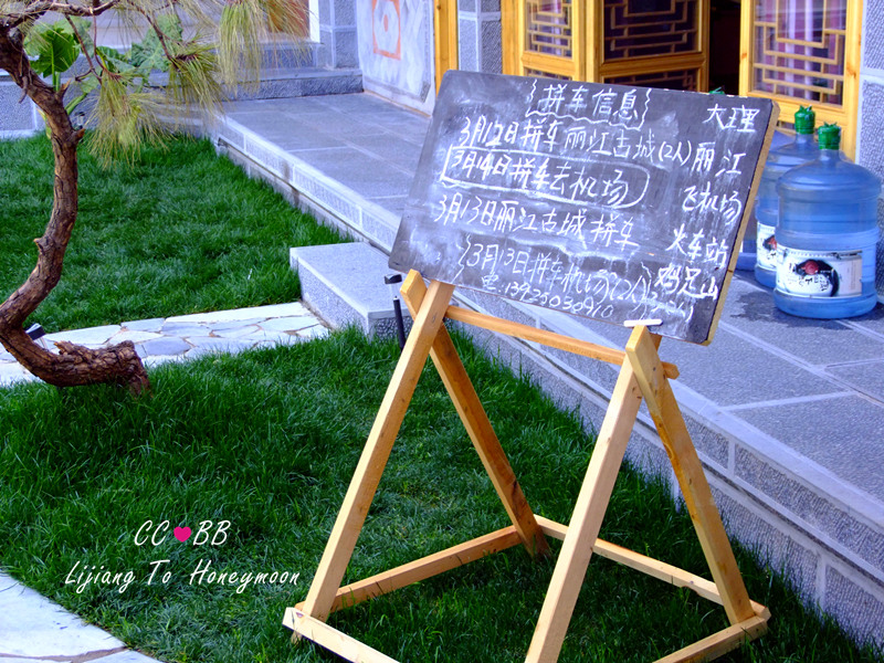 下榻安稳后,首要任务就是去找拼车的朋友,回到1号院,问管家,她说在旁边黑板留言就可以了!因为我只在双廊 预定了一晚的房,为了不走回头路,我们要找次日14号拼车去丽江 的朋友,着急啊~黑板上只看到了15号拼车的信息……继续前往其他客栈找找……