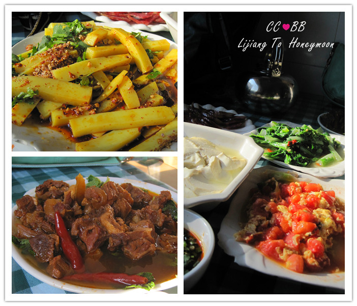 4点半到了山脚,拦了一台蓝牌车20元包回了客栈!找了一家“郑河园”餐馆(就在金岸春天小区对门),不清楚他们菜的分量,结果点多了!关键是饿了!看着什么都来劲!