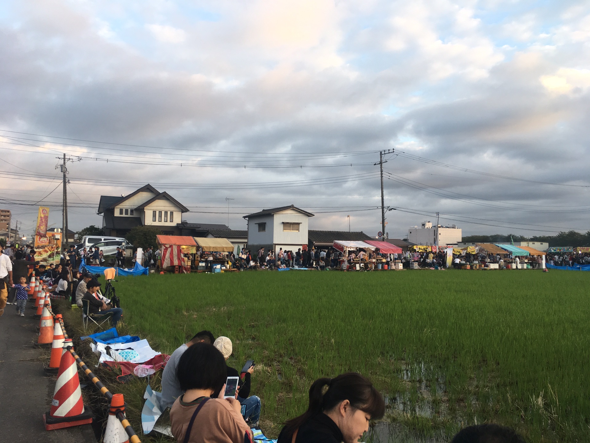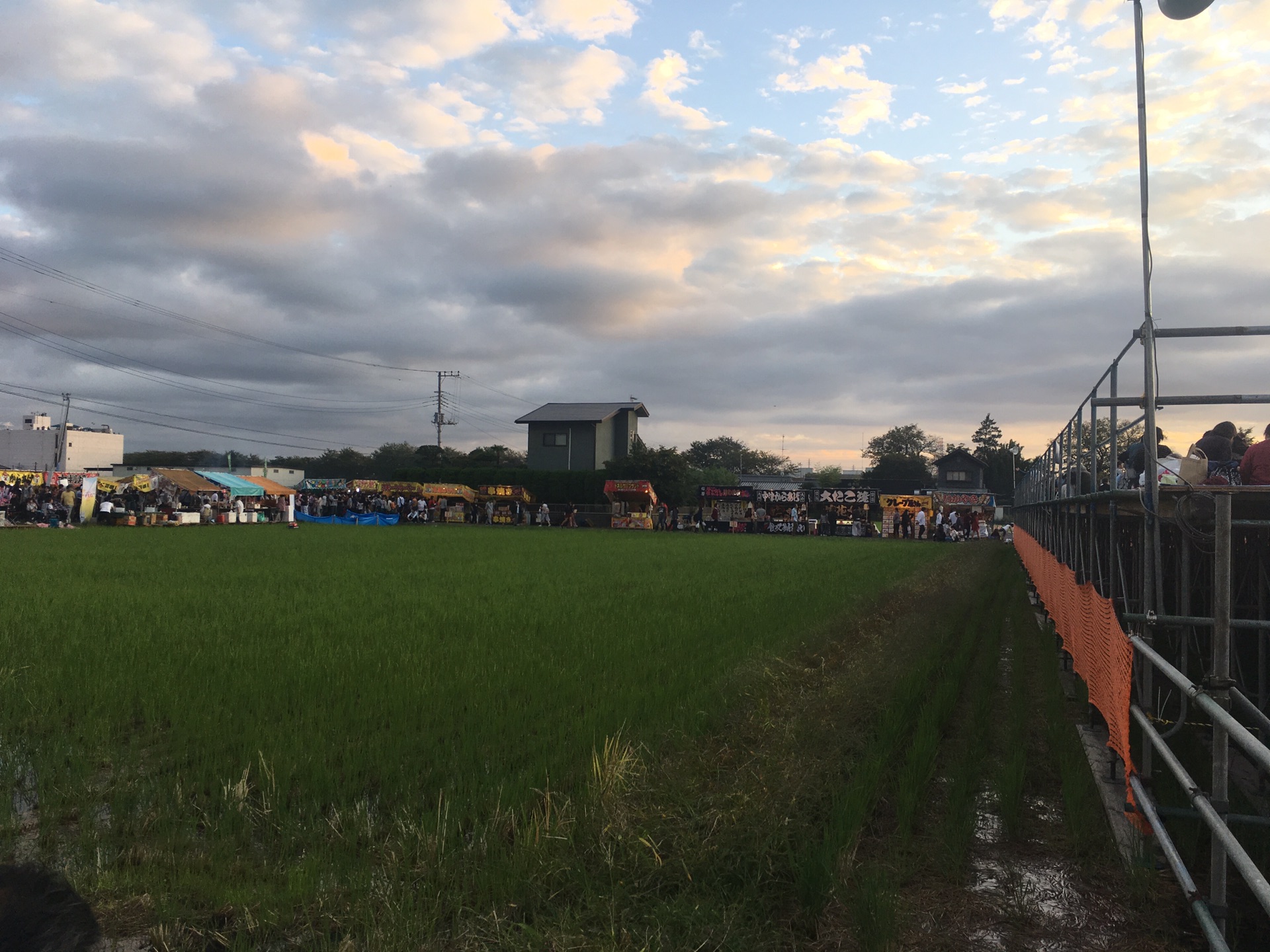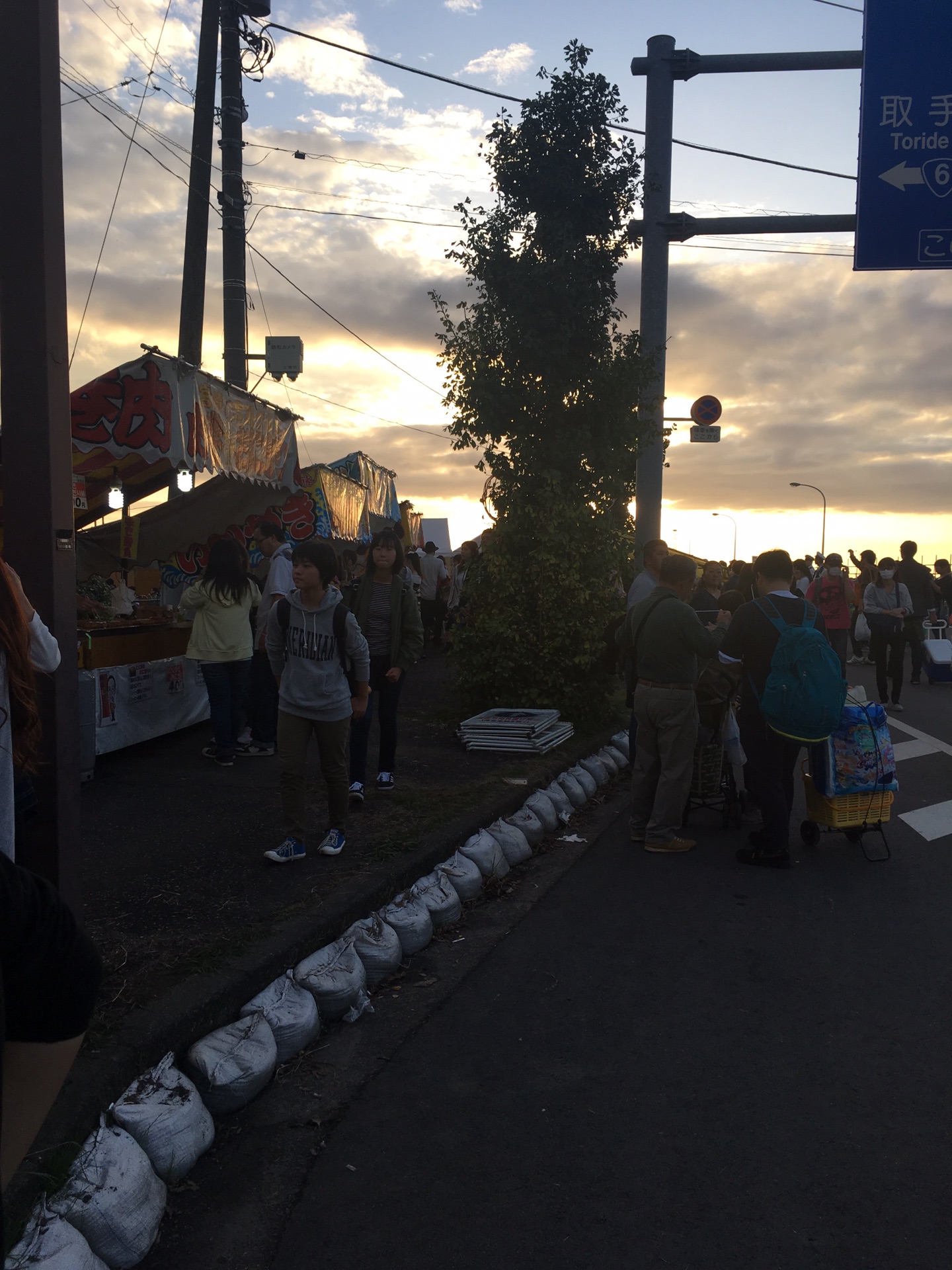好不容易找到个地方,左边搭架子的是收费的看台,我们就坐免费的吧。周围的霓虹人民都是自带垫子、折叠椅的,我们隔壁的一位好心欧巴桑看我们没东西坐,就很热情地把自己多带的野餐垫借给了我们。