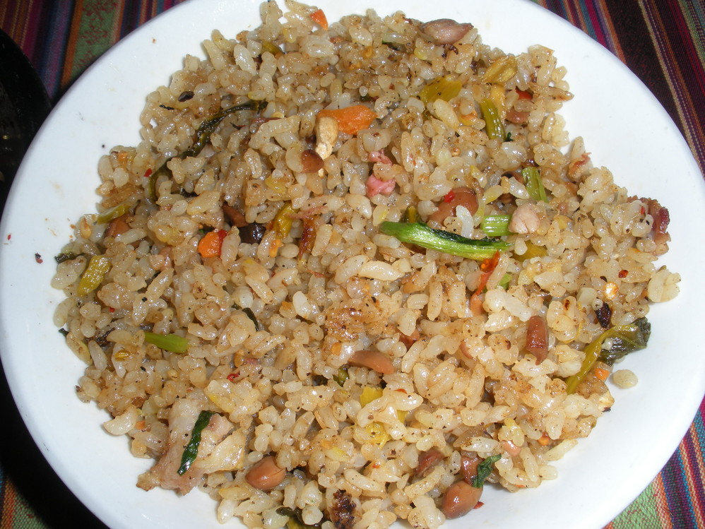 纳西炒饭,炒饭里面有肉,青菜,酸菜,酸豆,酸酸的,个人觉得有点咸
