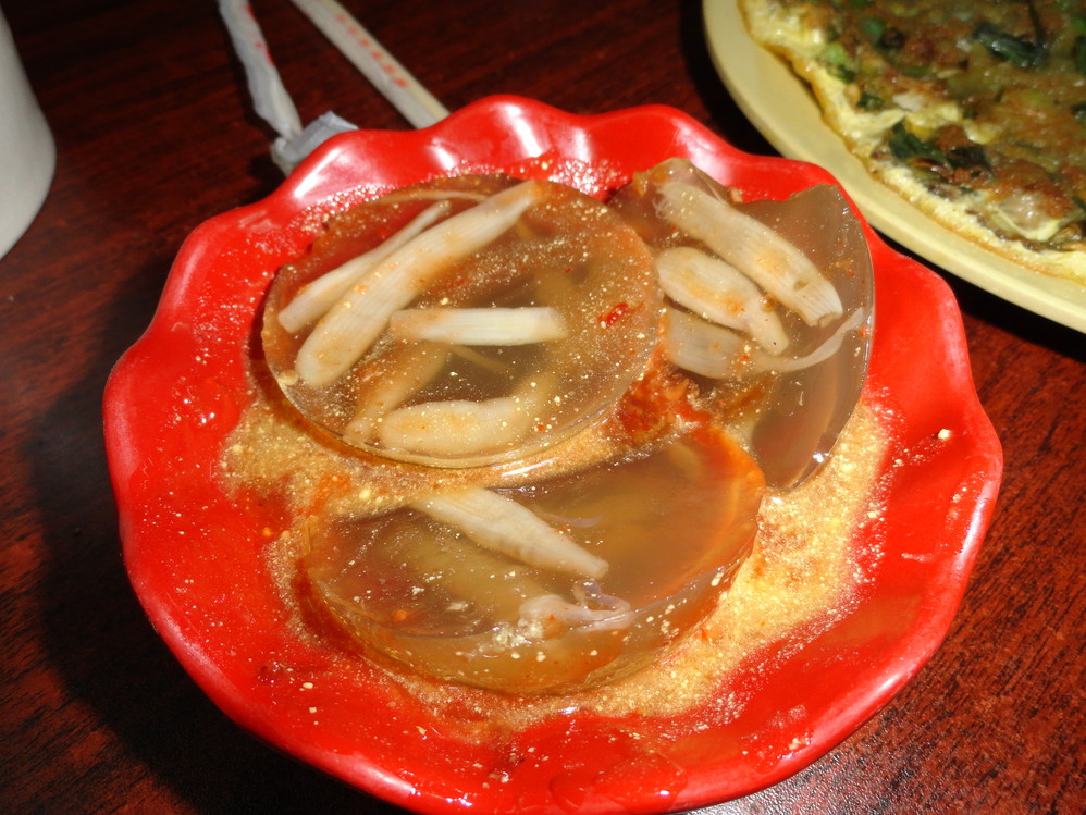土笋冻,不说真不知道,里面白色的是虫(应该是海产类的)是沙虫,见过活的,一开始以为是象拔蚌呢。口感像鲜笋放进果冻里,味道全靠外面的酱汁,甜不甜酸不酸的,很一般