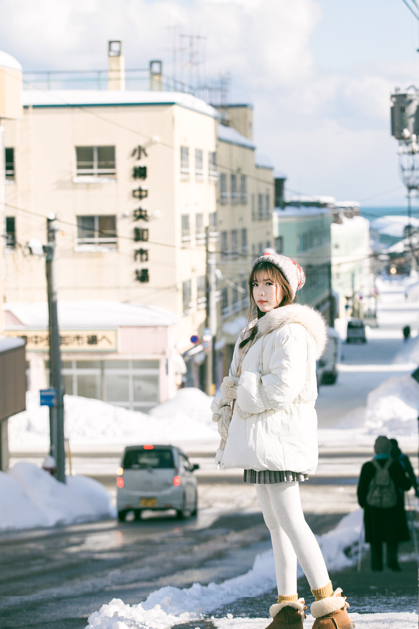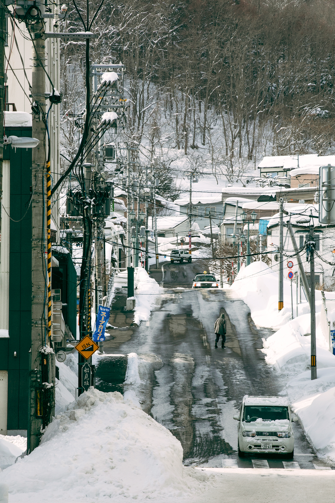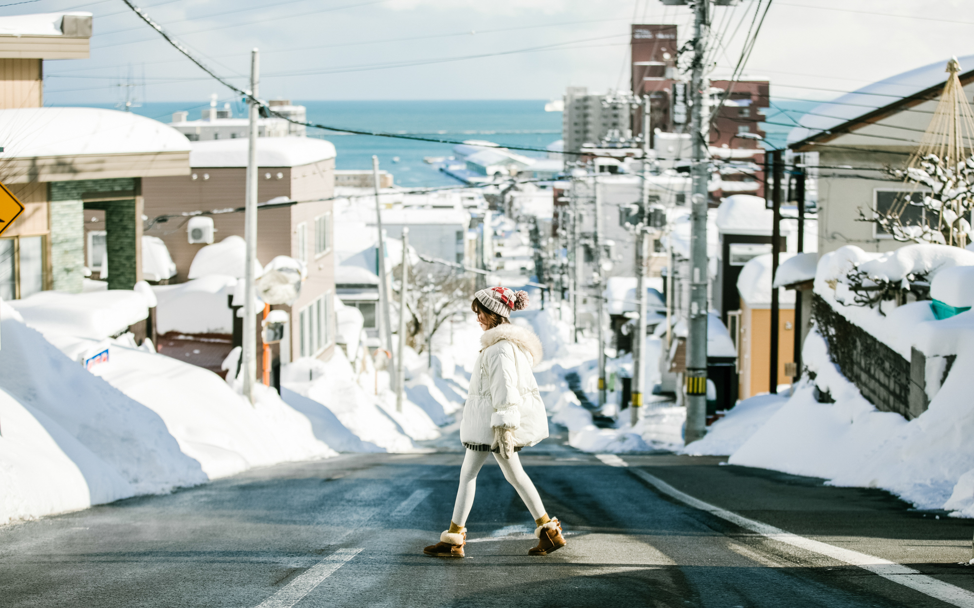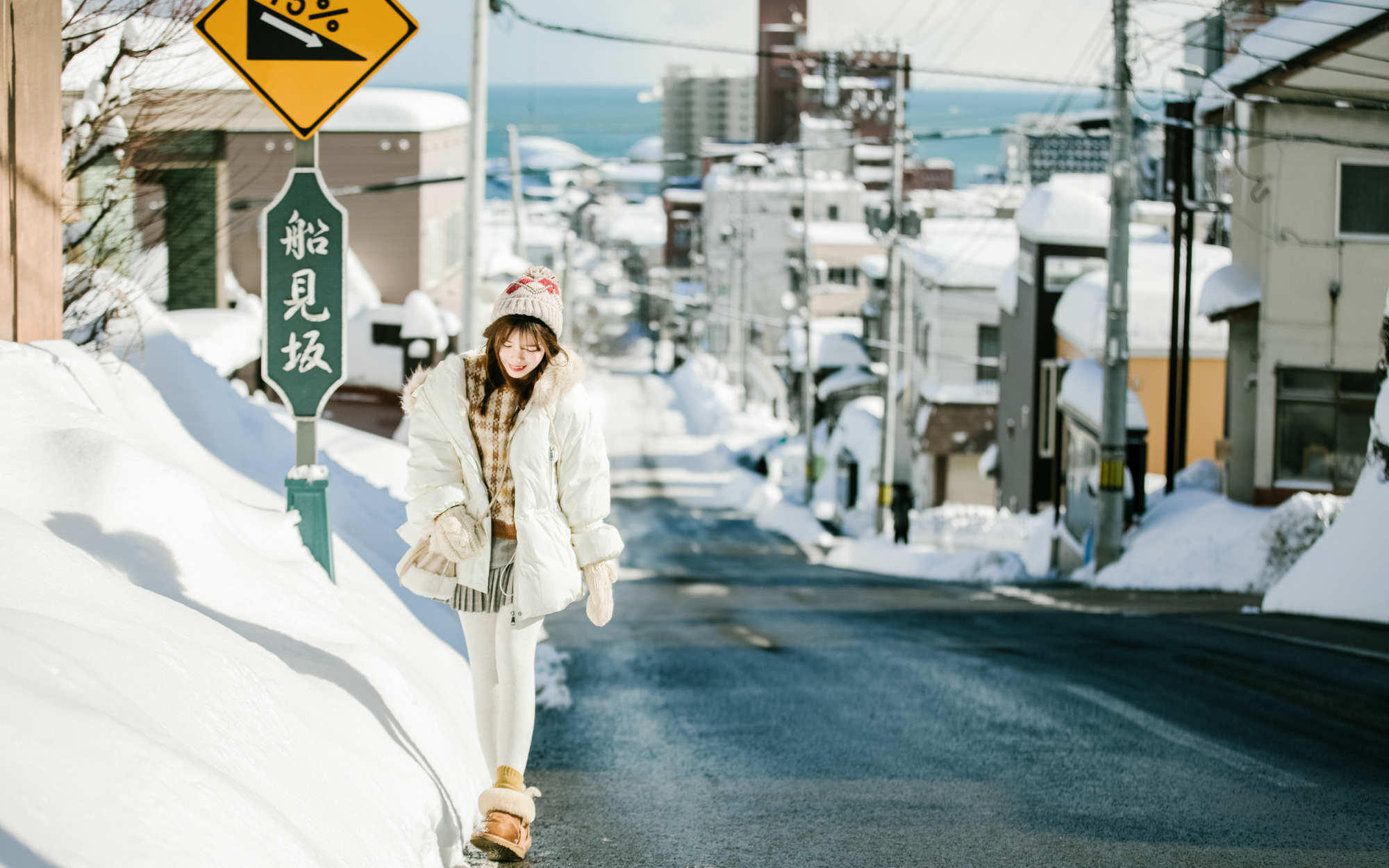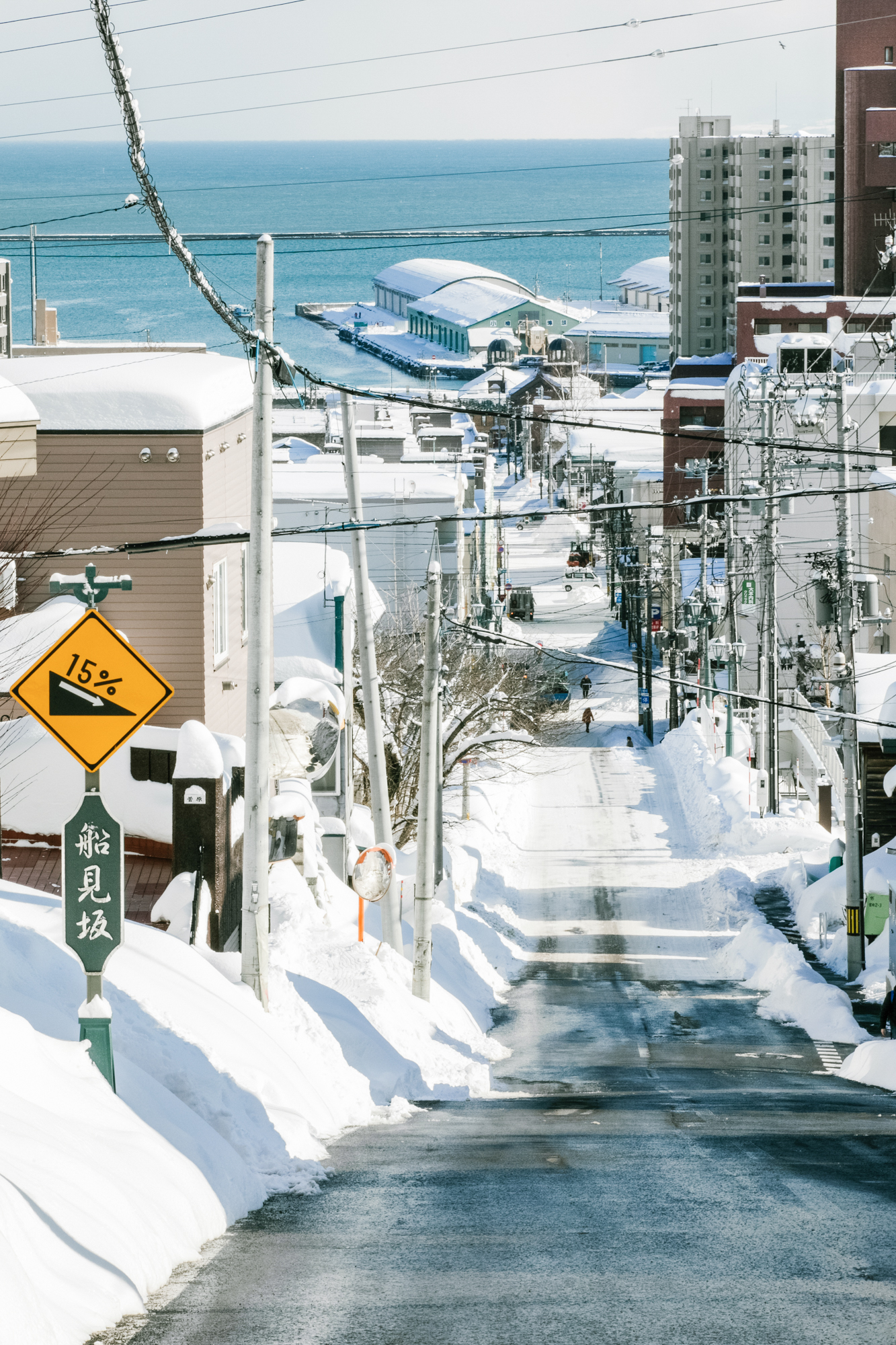 小樽的街道基本都被雪覆盖了,每一条路加了雪之后,就有了电影的画面感。没走几步,就到了船见坂,这里就是《情书》中邮递员送信的路,一步步向上爬坡,从顶部向下眺望,天气好的话,你可以沿着笔直道路的视角,一直延伸到海岸港口。
