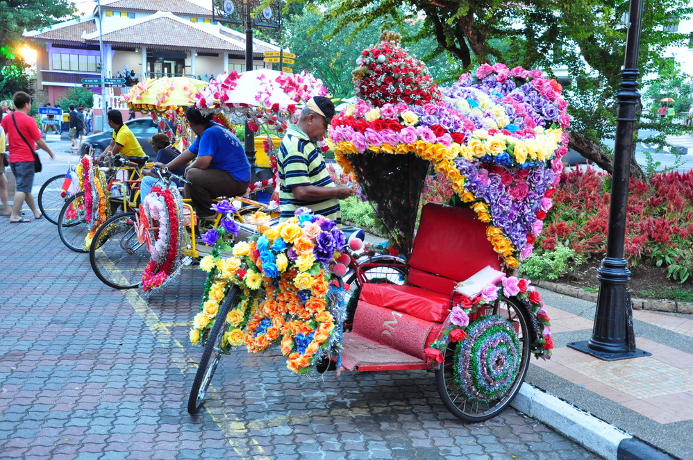 值得一提的是名声在外的马六甲“花车”。马六甲的“花车”都集中在红楼广场(/poi/6317110.html)一带,所谓“花车”就是类似我们国内的人力三轮车用色彩斑斓的花环、花带和花牌整个包裹起来,游客坐上犹如置身花丛,然后车夫蹬着你沿街游览,煞是美艳,适合拍照。不过价格不菲,大约1、2公里一圈马币20(合人民币40)。