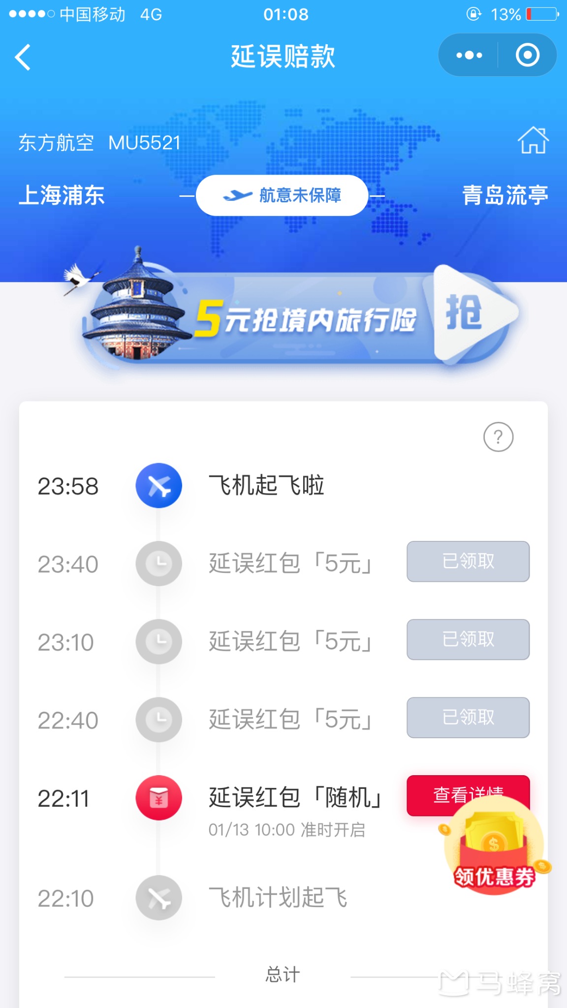 吃完后,四个人坐在那儿继续刷刷航班信息,发现航班百分百延误了,于是大家立刻买了延误险。这个延误险能在飞机原指定起飞前40分钟购买,每延误半小时赔偿5元,而且微信小程序里即可购买,性价比还是不错的。
