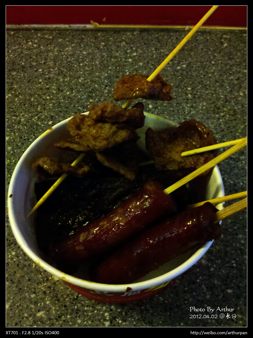 果然跟朋友说的一样,正宗的长沙 臭豆腐是黑色的,味道也的确比其它地方的好吃,虽然要了份不辣的(¥5),不过里面还是伴了些辣椒汁。