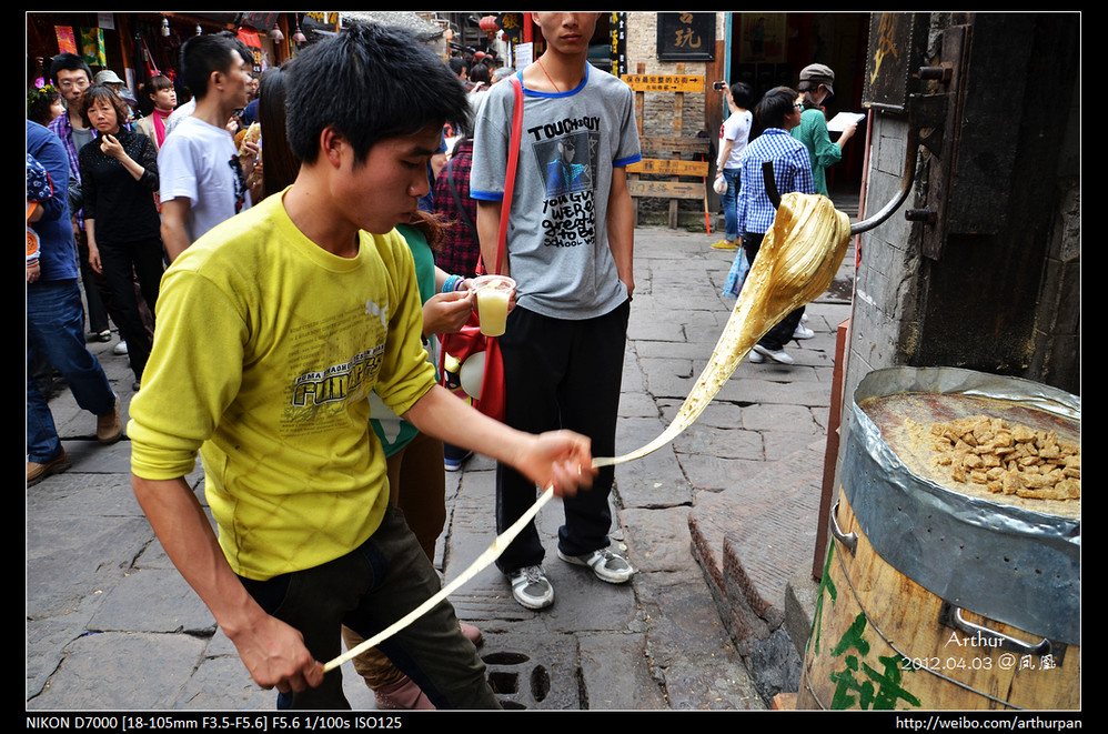 在老街 上自然少不了需找美食,刚进来就听到有一家的喇叭特别大,好像在播着单口相声,无非就是称赞店里的食品多好多好,不容错过这类的。