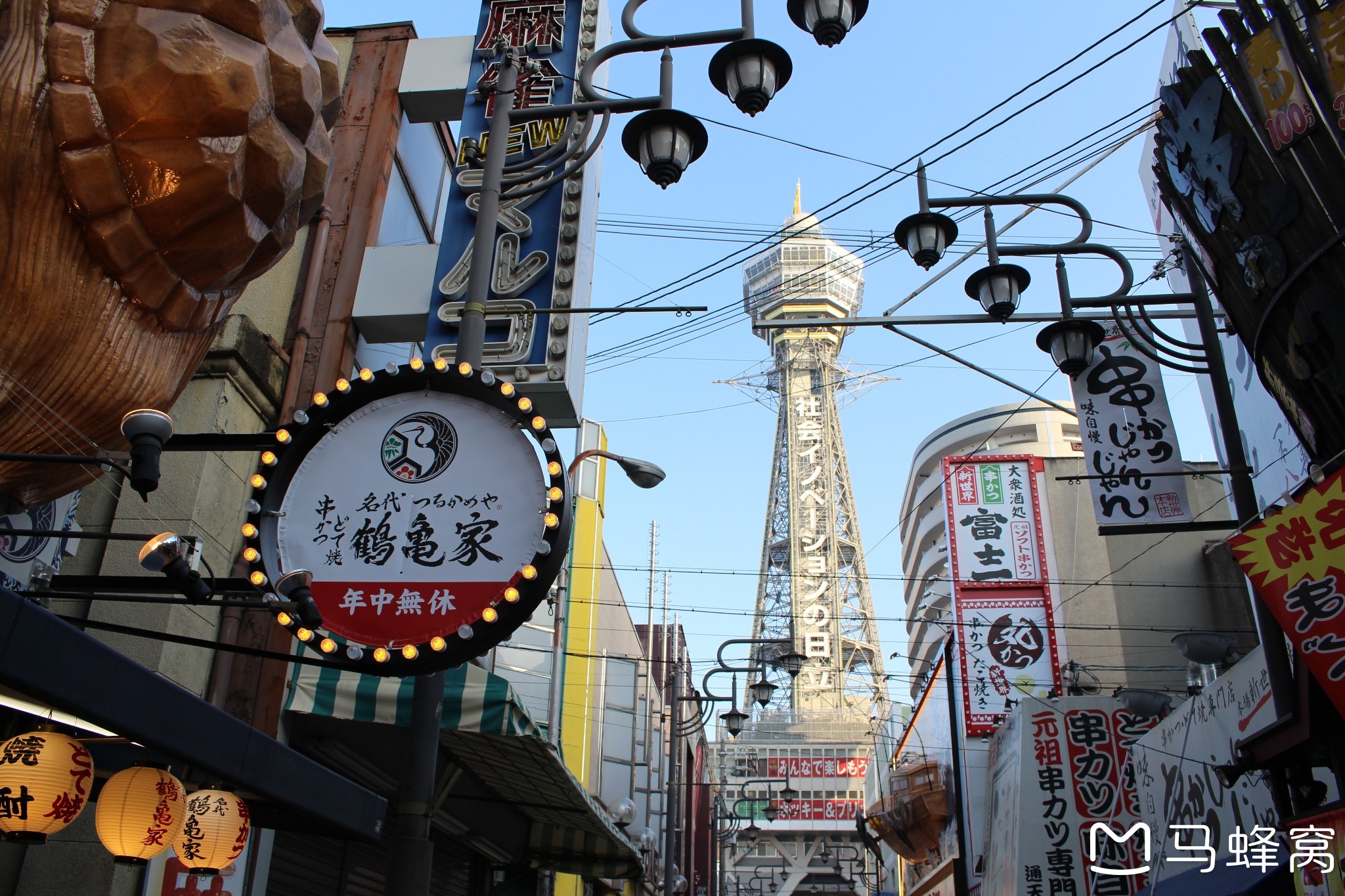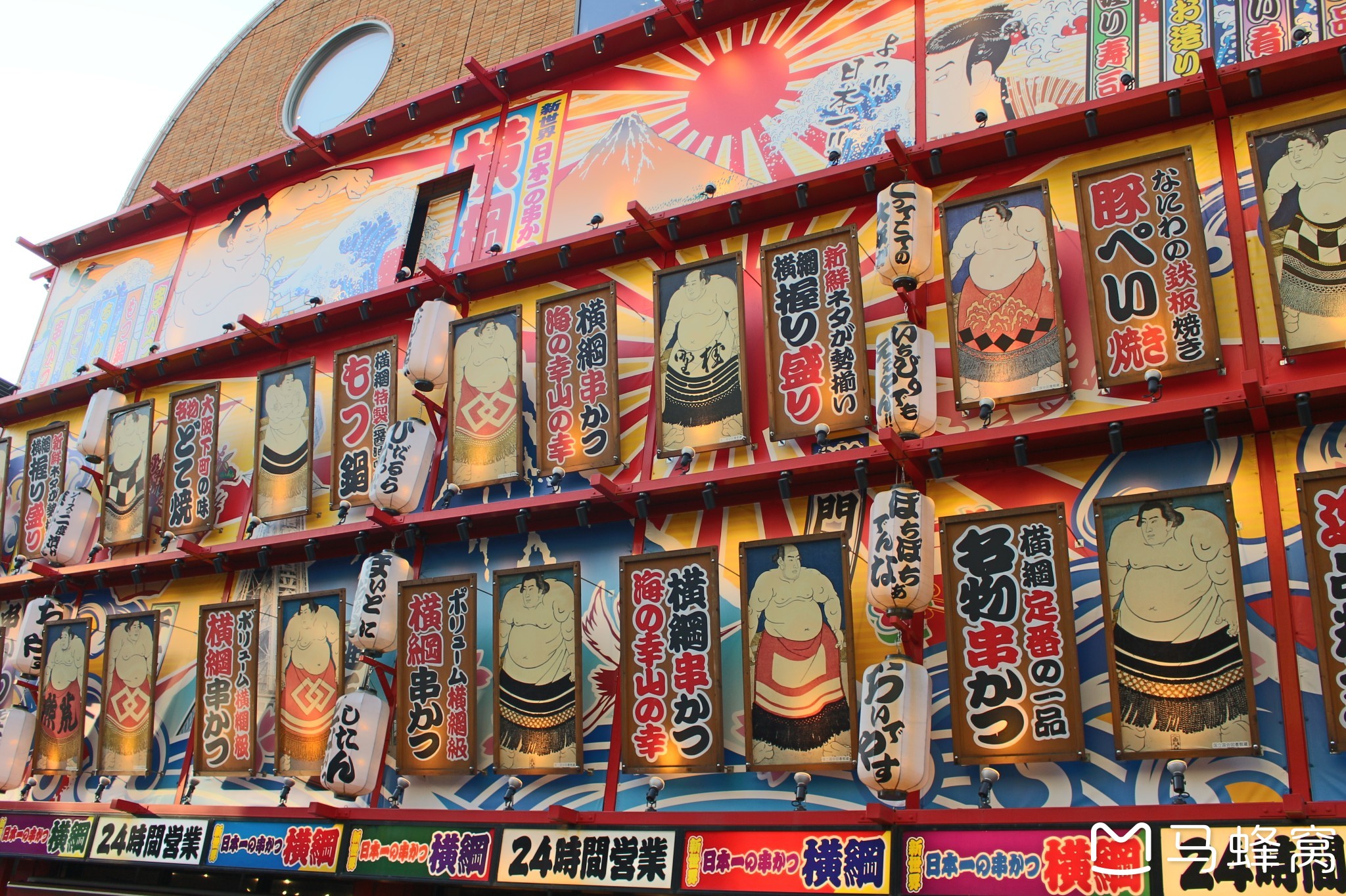 路上有一排排扭蛋机,我扭了个海贼王的扭蛋。通天阁下的新世界商业街也还没热闹起来。我一直在转悠,很多店的招牌和装潢都是日式风。印象最深的是有一家串串店是以好多相扑漫画形象为装饰的。我找了位于高处的台阶拍通天阁,也遇见不少前来瞻仰通天阁的日本人,看见几个老爷爷和通天阁合影。有一个日本萌妹请我拍他们和通天阁的合影。他们一家都长得很清秀,应该是天皇诞生日放假爸妈带姐弟出来旅游。姐姐的手机屏幕摔出裂痕了,她设置的滤镜是粉色的,可以说很少女心了。给他们拍了几张照片,我觉得不错,问他们OK吗,他们表示很满意,十分感谢我。给这么幸福可爱的一家人拍照,我的心情很愉悦。