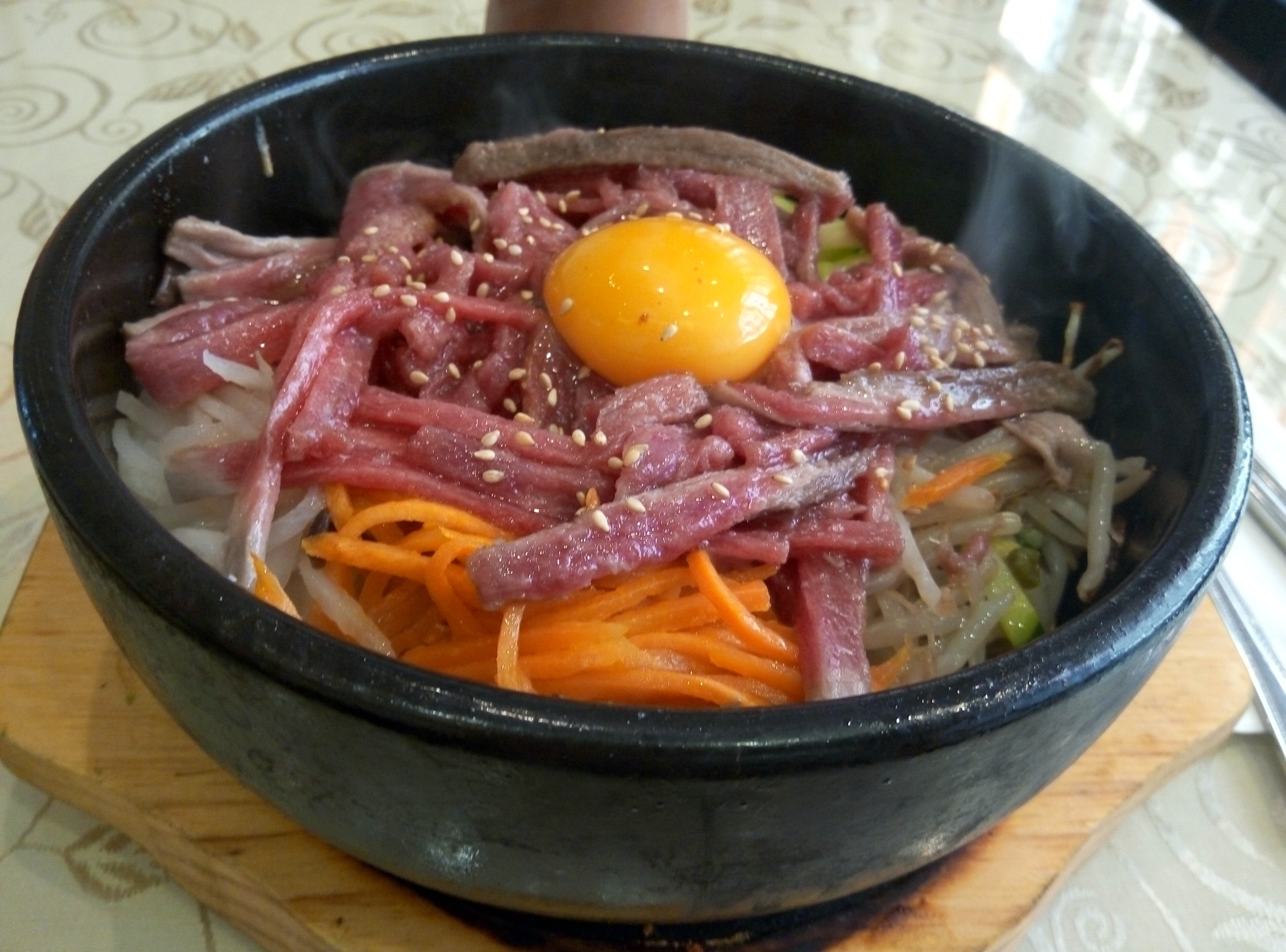 在哈罗德办完退税手续后,就回去酒店取回行李,准备前往约克。出发前,先去吃个生牛肉石锅拌饭,yummy~~~虽然我不讨厌吃西餐,但从小被粤菜喂大,而且父亲大人还是位厨师,所以我其实更喜欢吃中、日、韩这三国的美食。英国的中餐都是改良过,适合西方人的口味,所以要找到好吃的中餐其实也不容易。如果有外国朋友跟你说哪家哪家中餐很好吃,但他/她又没有去过中国的话,那一般推荐的都是符合他们当地人口味的中餐,我们这些土著是不会觉得好吃,只能算是凑合着吃。