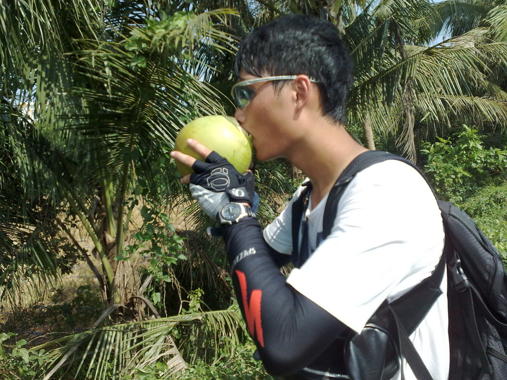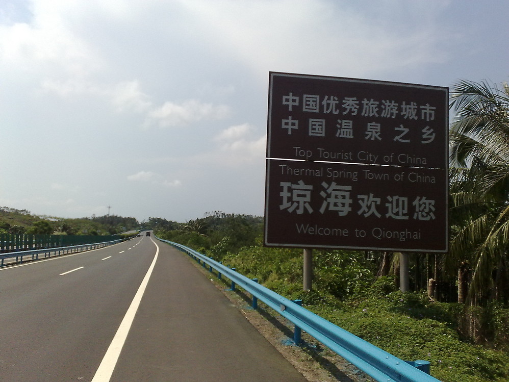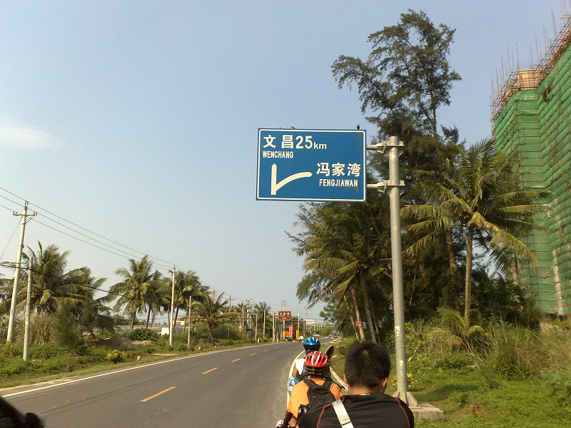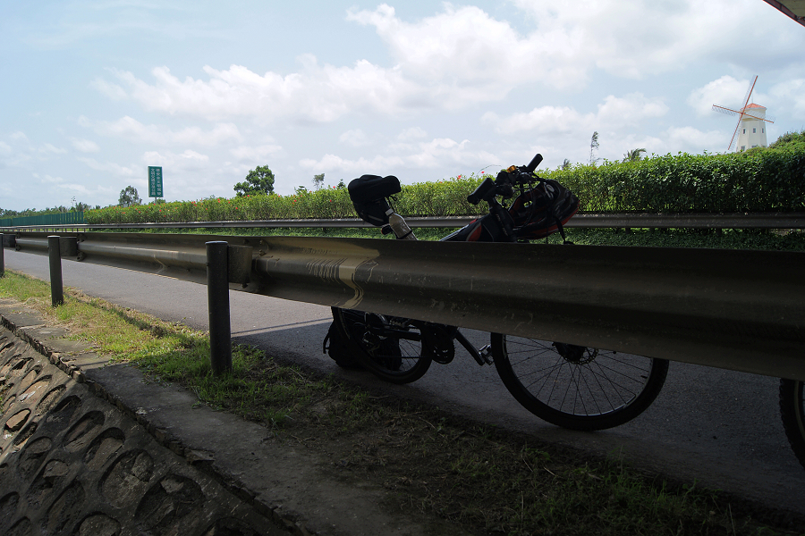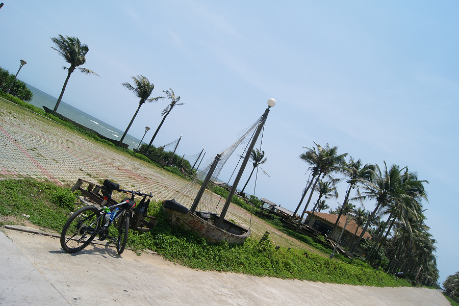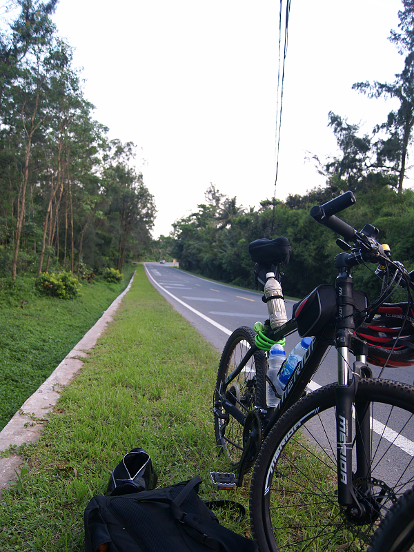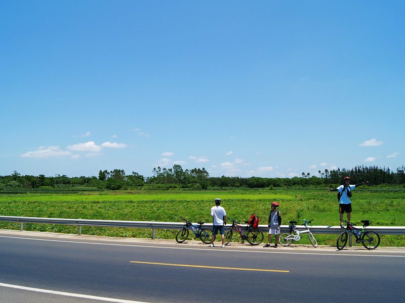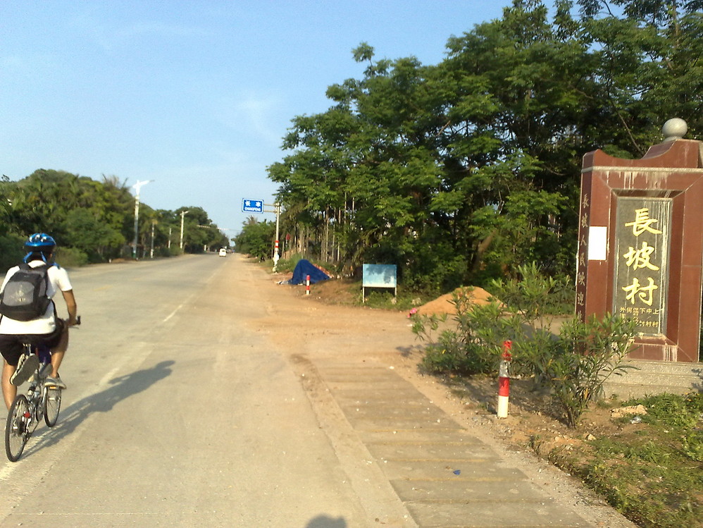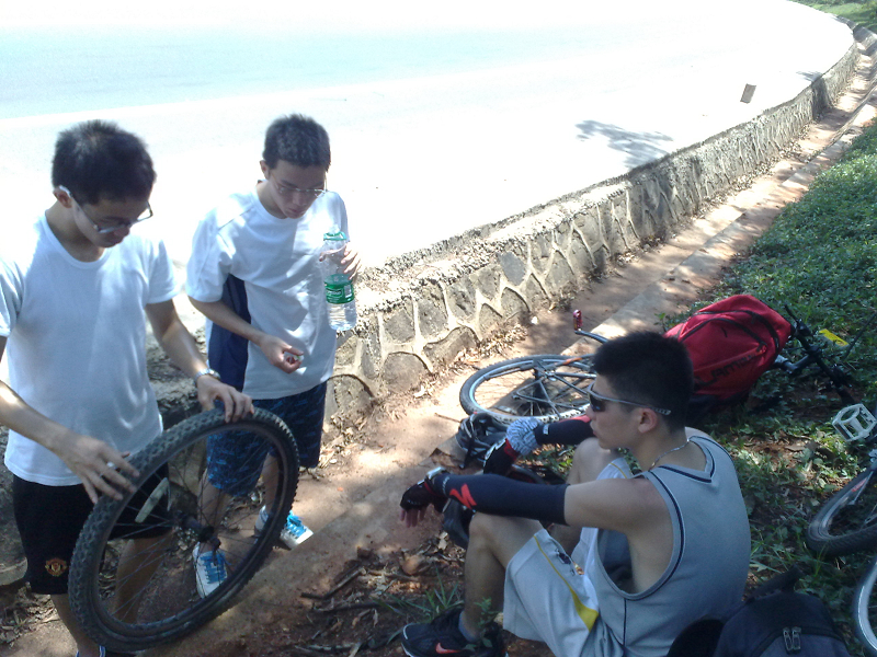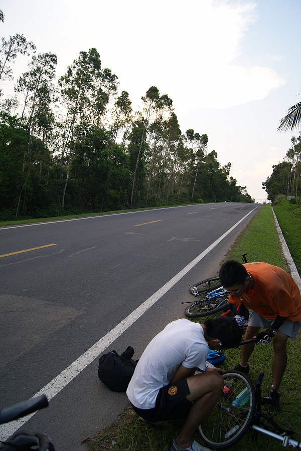在去往博鳌 的路上我再一次爆胎,就在补胎的时候遇到从广西 来的黎伯伯,黎伯说他刚退休,骑车一年半,在广西 认识很多车友,还约我们到广西 骑车。我们都很敬佩黎伯,他说他一天可以骑150公里,我们听到后都感到非常惭愧,我们骑行最多的一天也就是90多公里