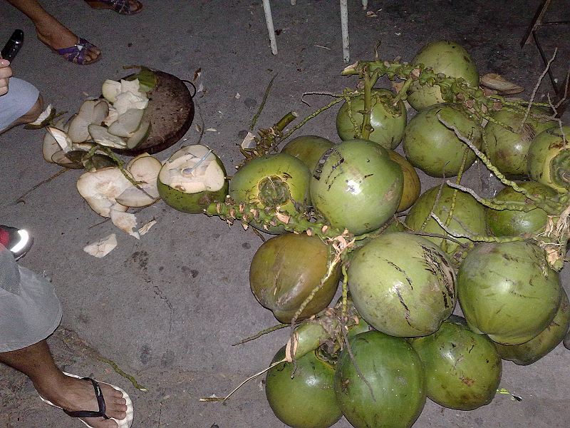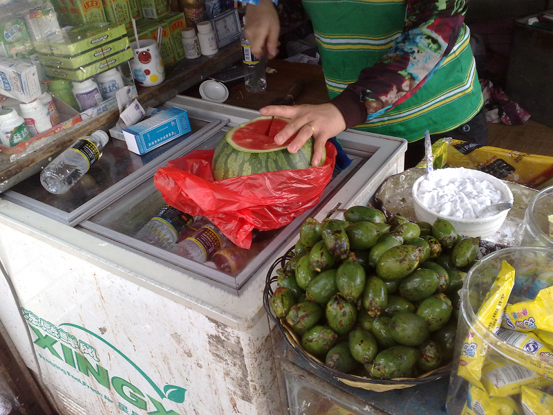 ,到当地买了个西瓜解暑,2.5元一斤,吃后感觉被坑,不甜、还有点不熟的感觉。图中右下角绿色的就是槟榔