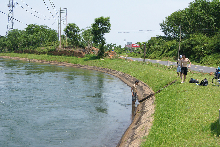 路过一个水库,发现库水很凉快,骑得满身大汗的我们马上用库水降温,下水嬉戏