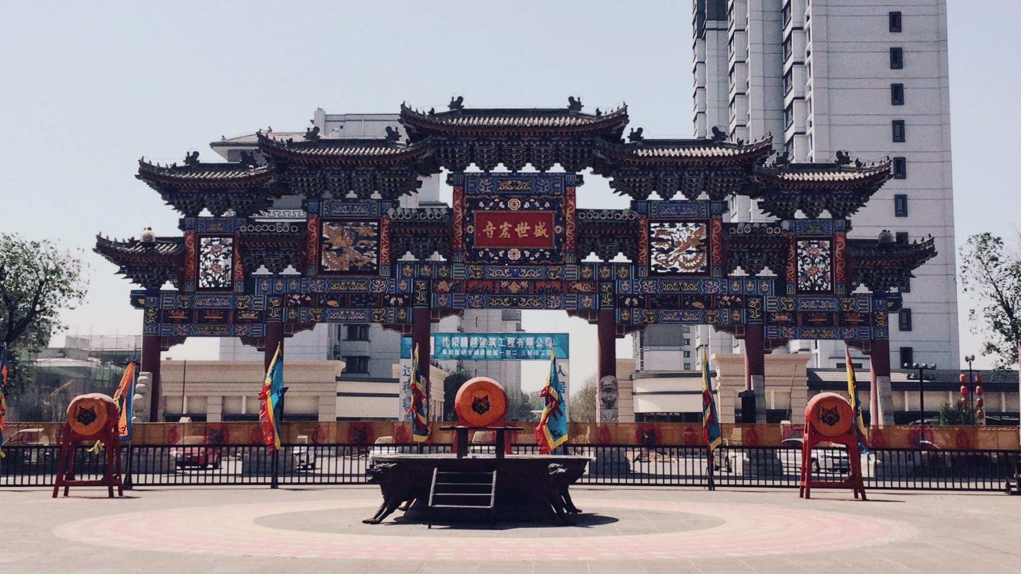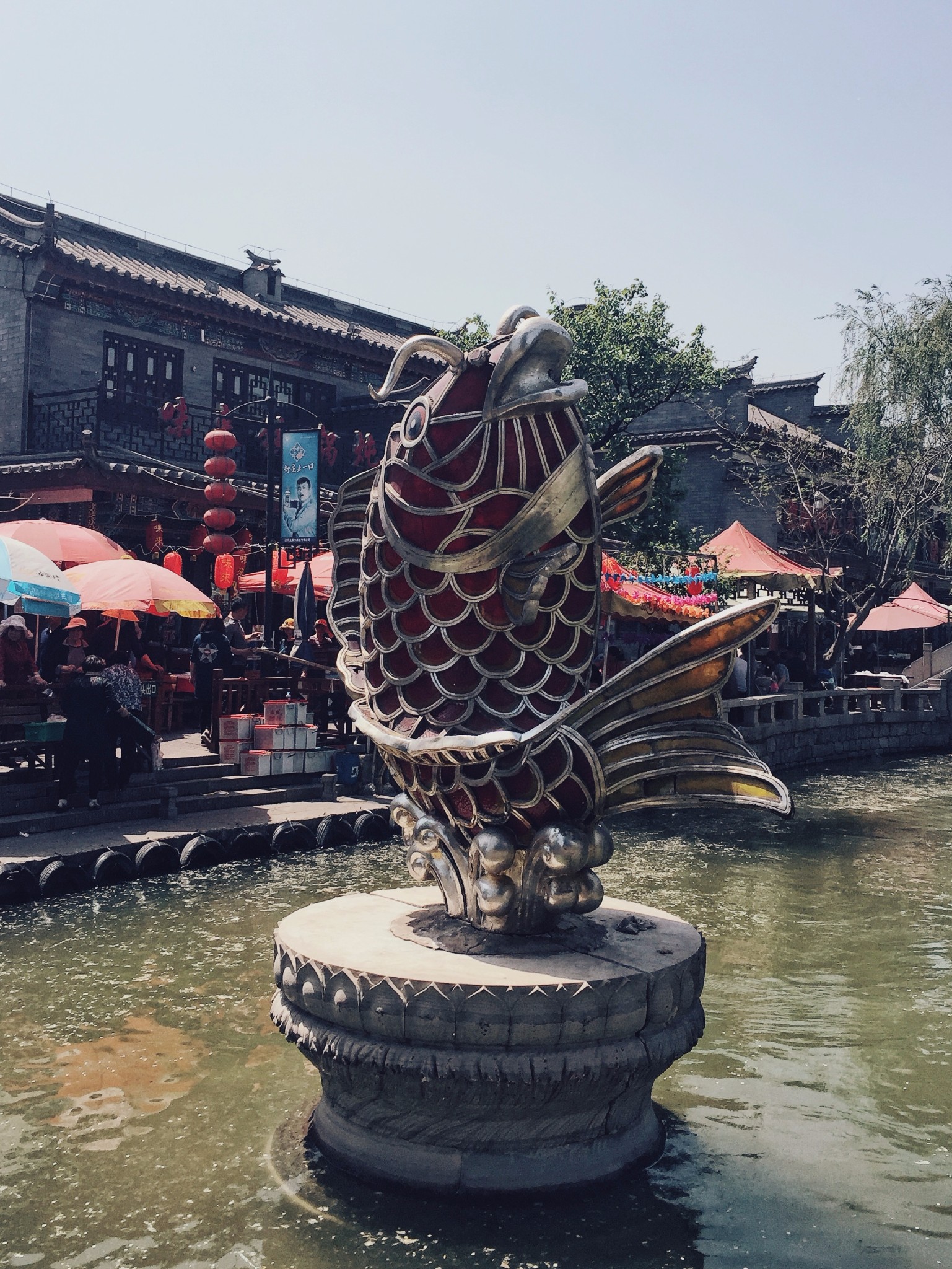 “古城”中,人造景点还是很多的,满眼尽是一水的明清风格的中式古典建筑群,比如近在眼前的东城门迎宾广场、关帝庙、文庙。再向前走就能看到紫金塔等。