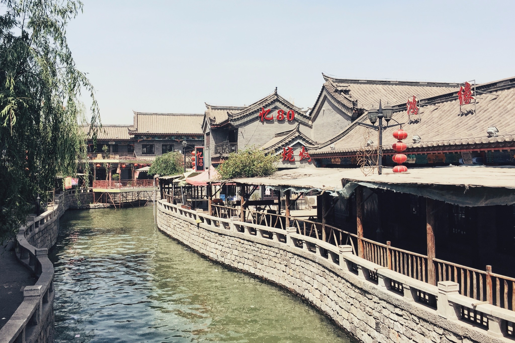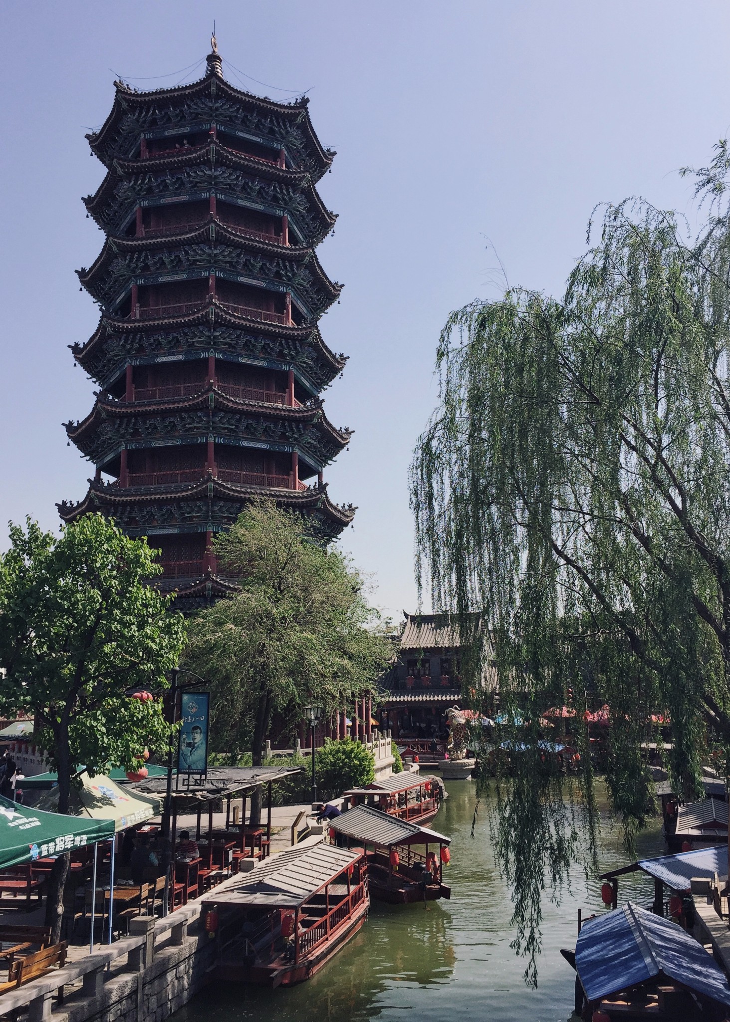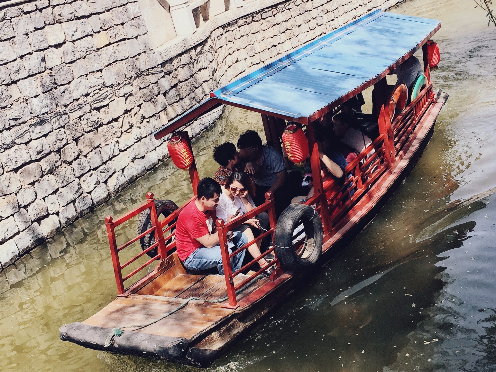 紫金塔下有一个游船点,游客可以在此乘坐游船体验一下古城的水路风光。亭台楼榭,也算有一丝水镇神韵。
