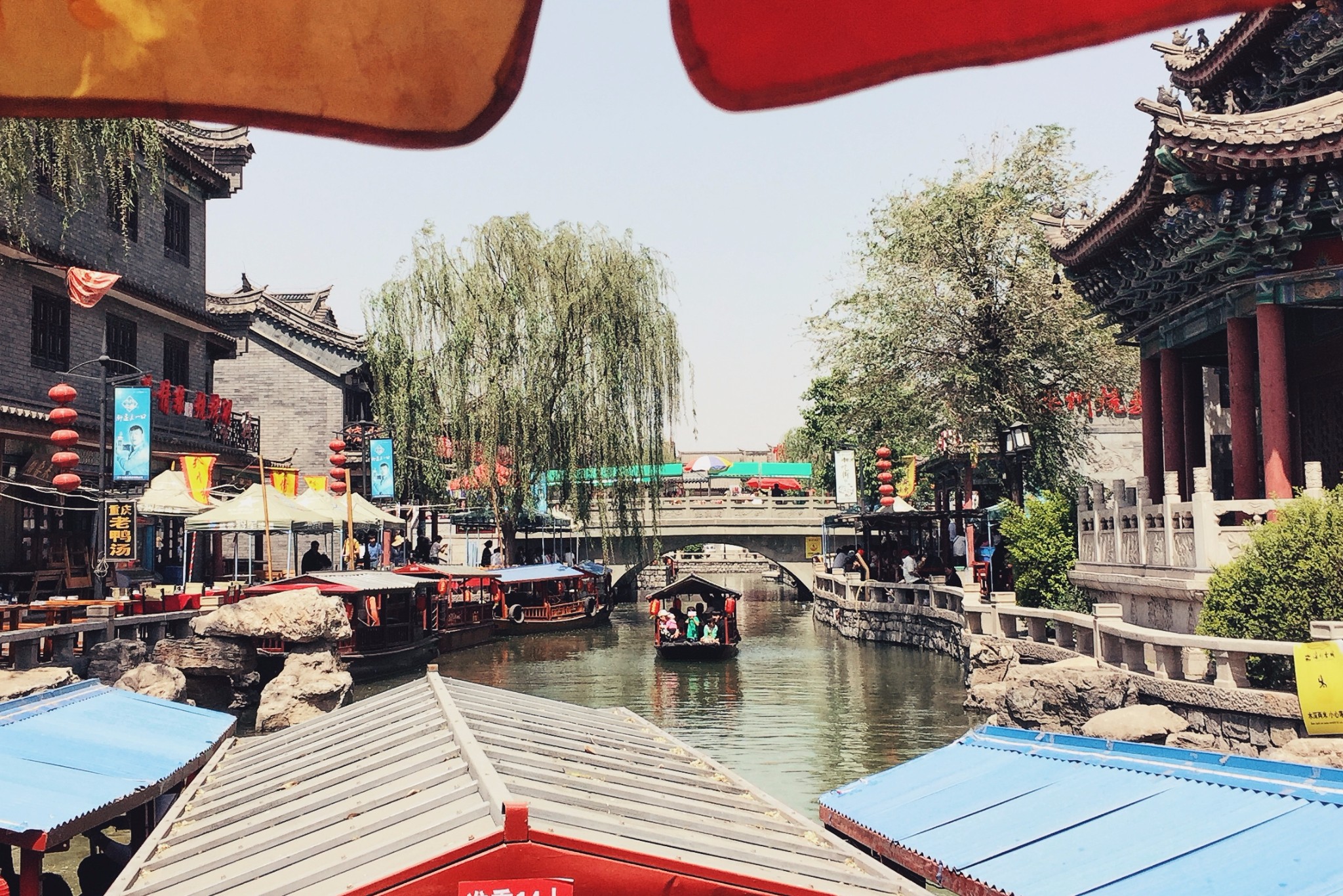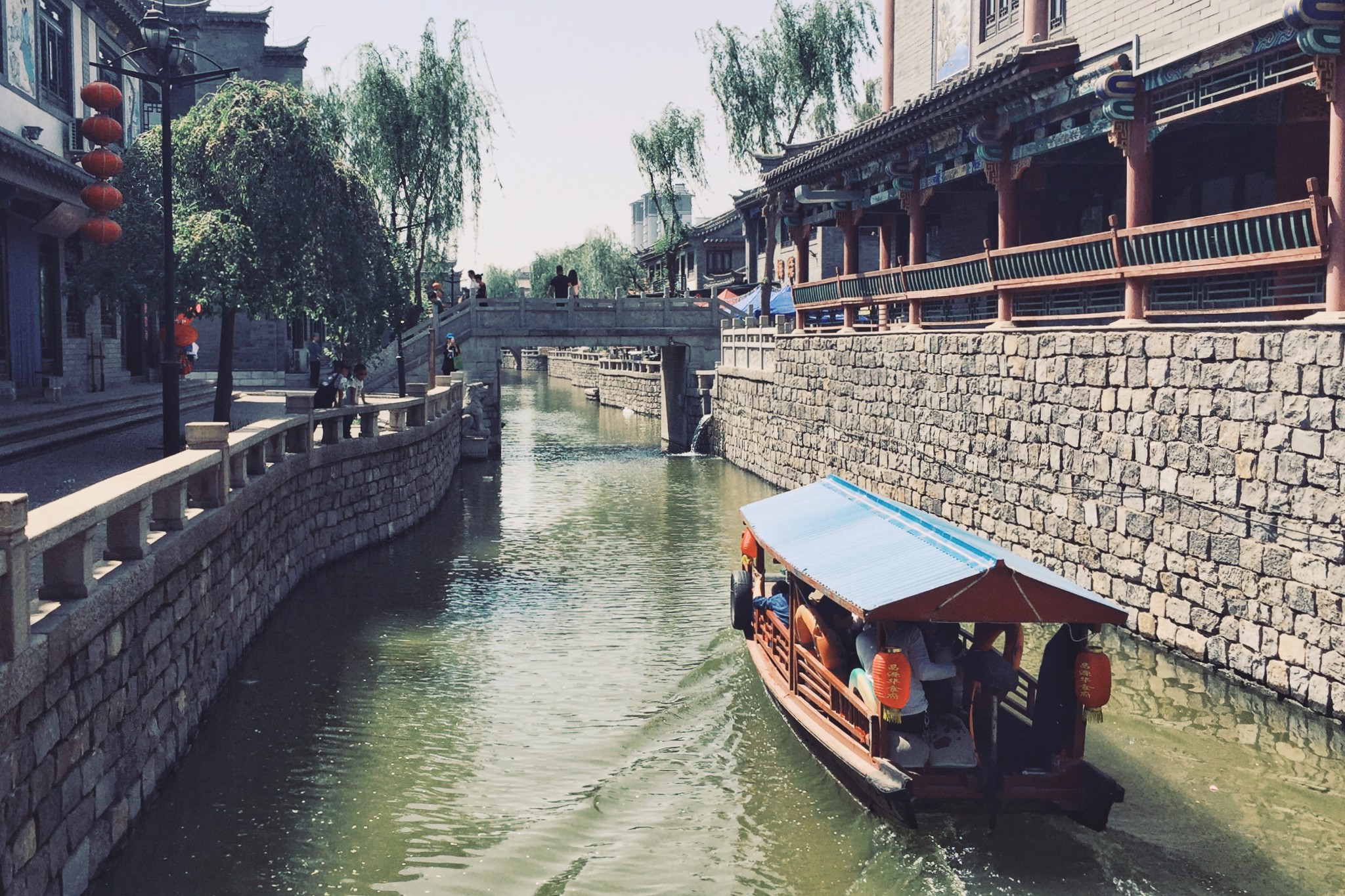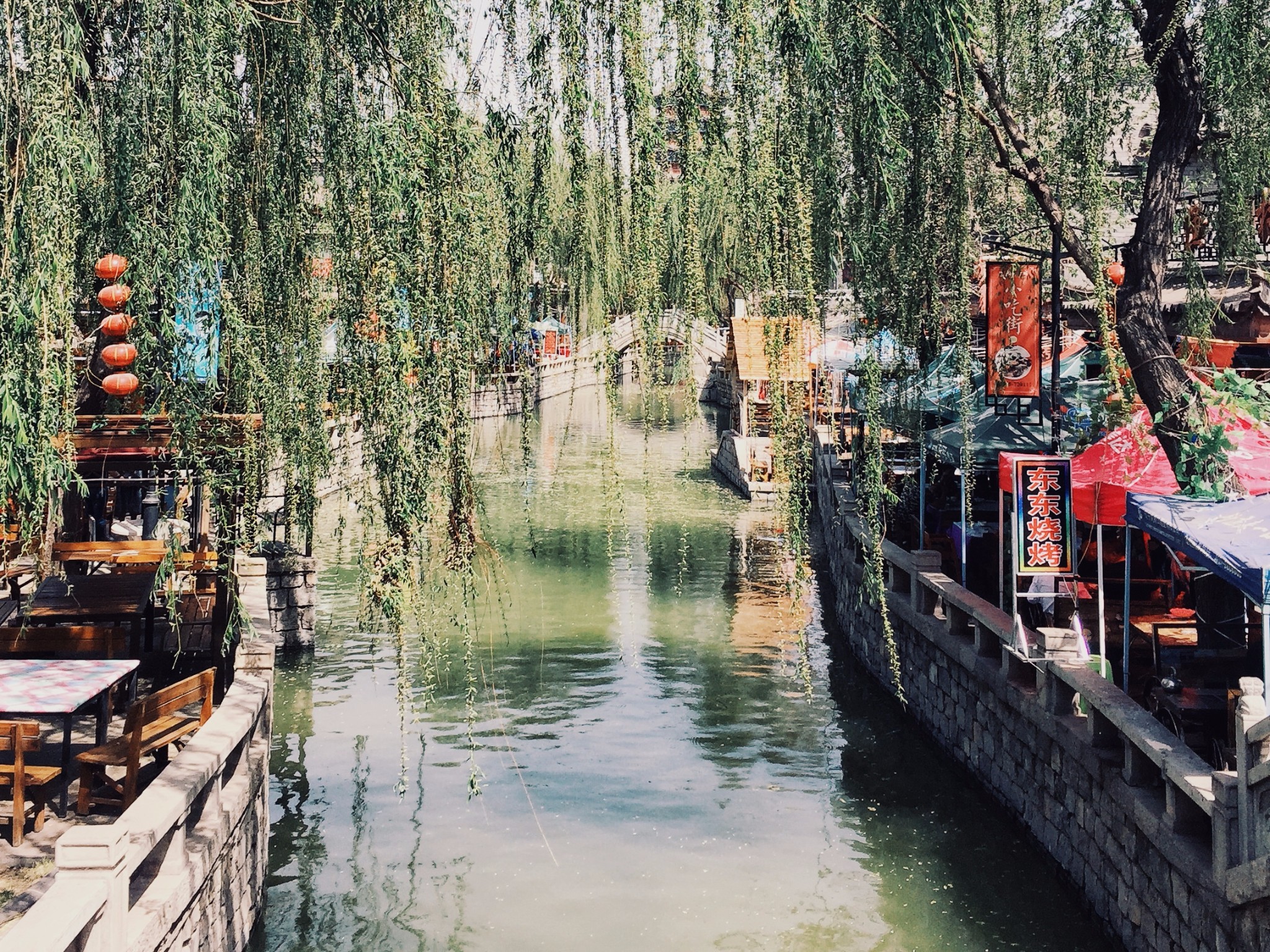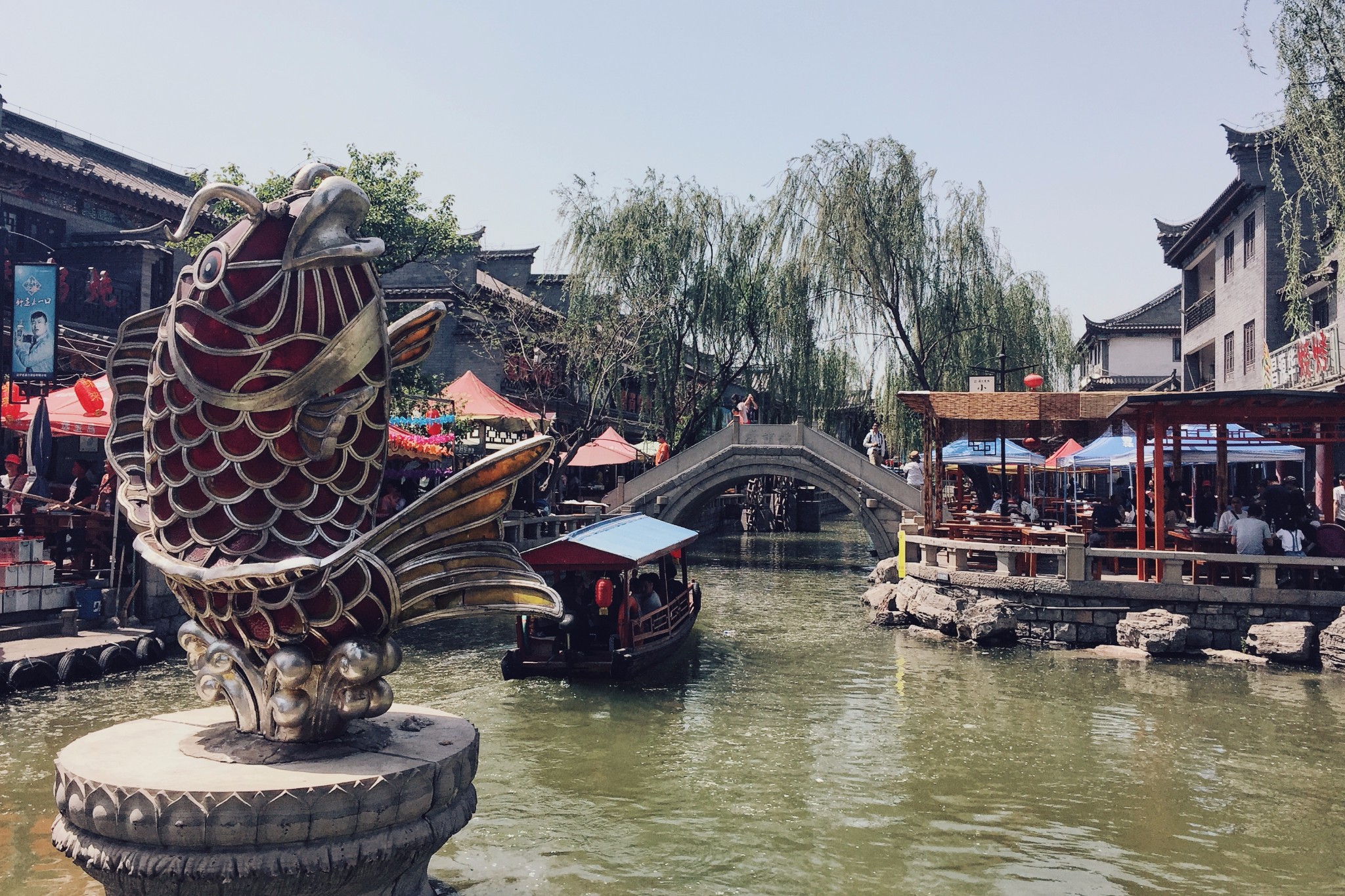 紫金塔下有一个游船点,游客可以在此乘坐游船体验一下古城的水路风光。亭台楼榭,也算有一丝水镇神韵。
