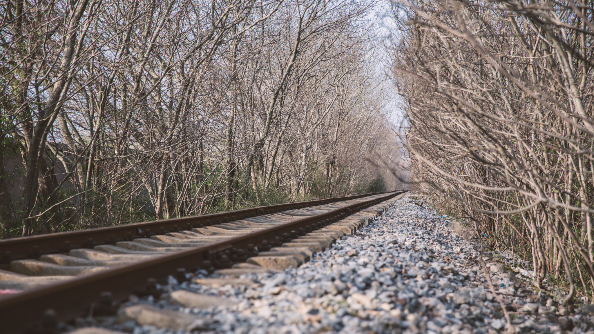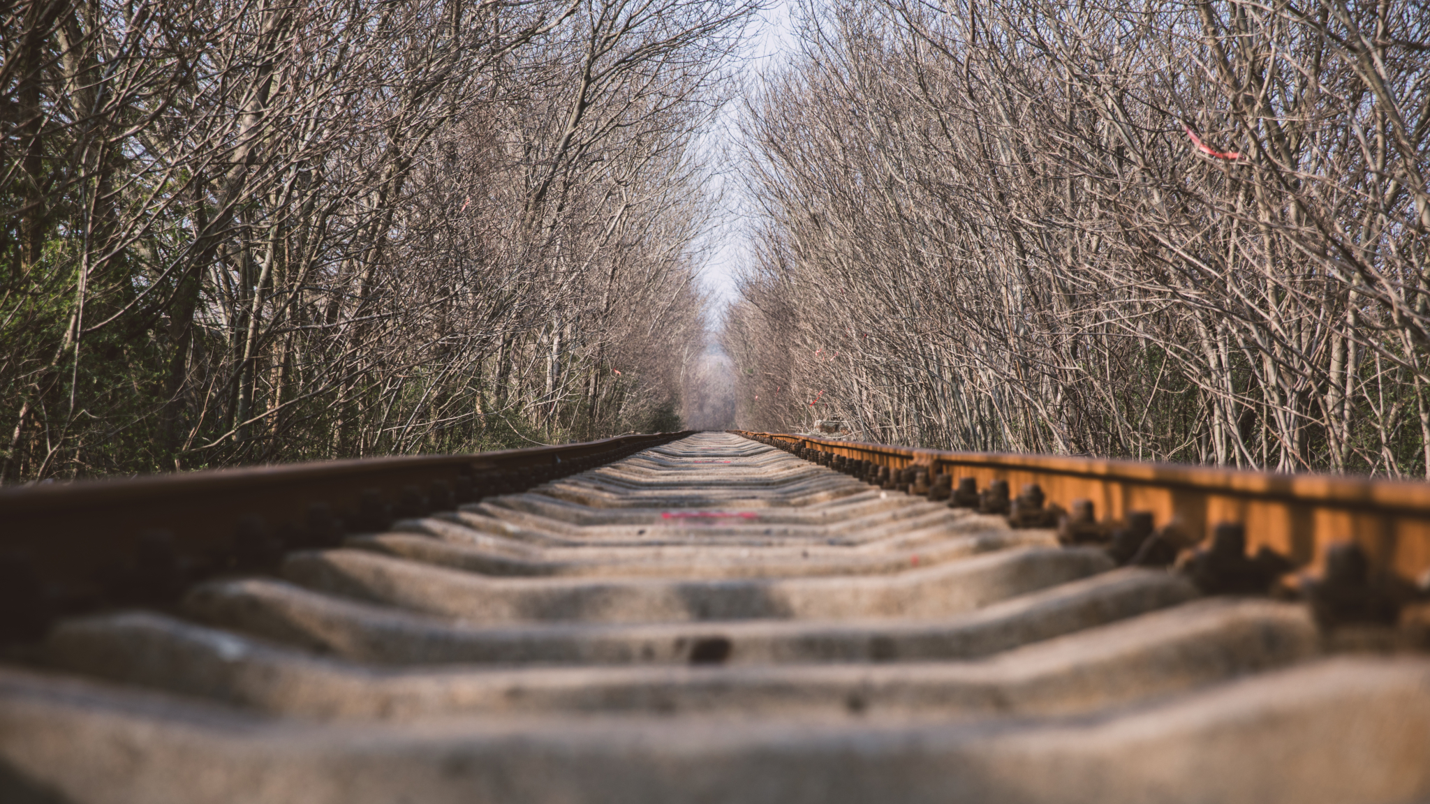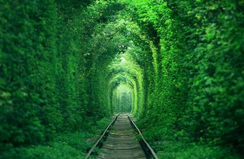 铁路两旁被郁郁葱葱的绿色植环绕,两边树枝交织在一起衍生至天空成拱形。