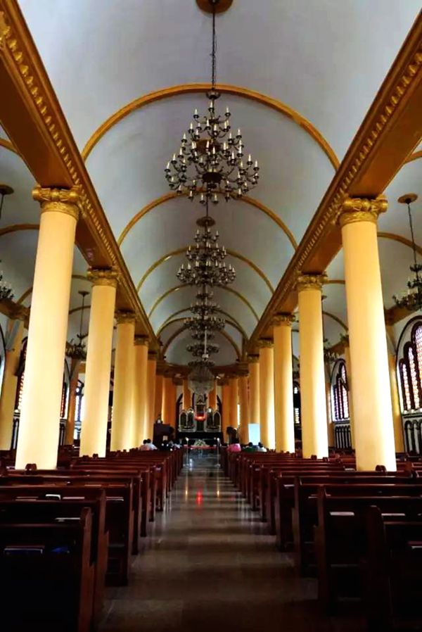 大教堂内白壁黄柱,镶有金边的拱穹顶高达9米,教堂祭坛处为环形,上为穹顶,顶部装饰有古铜吊灯,左右两列有十几根大柱支撑,墙面有西式彩绘玻璃窗户,这些大型的花窗实际上承担了“墙”的功能,能透光的墙,所以教堂内部宽敞明亮,又有种神秘的景象。
