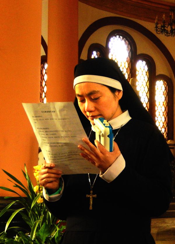 恰逢礼拜,信众在悠扬婉转的琴声伴奏下颂唱经文,接受圣水洗洒,既给人们带来心灵的净化,更使人们充满对生活的希望和对善的向往。普天同庆,欢聚一堂,在主教的主持下,琴声悠扬婉转,神长、教友的虔诚膜拜,共融于天主教的宗教氛围之中。