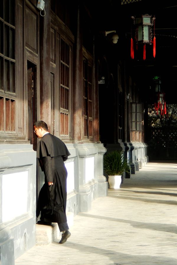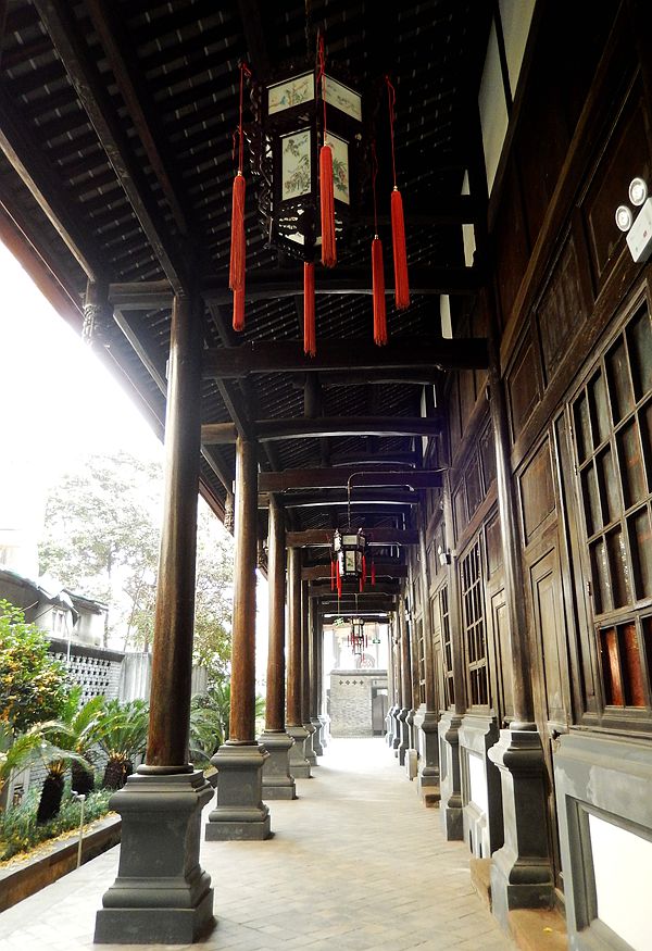 进大门是一大天井,中间种有小灌木树丛和花草,两旁高大的柱子支撑高敞的房顶,并有宽阔的走廊。