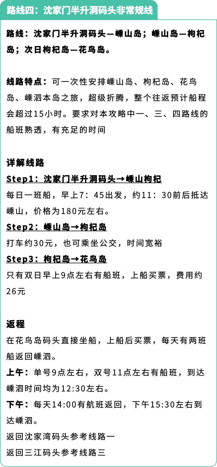 路线:三江码头—嵊泗李柱山码头;李柱山码头—小菜园码头;小菜园码头—花鸟岛。