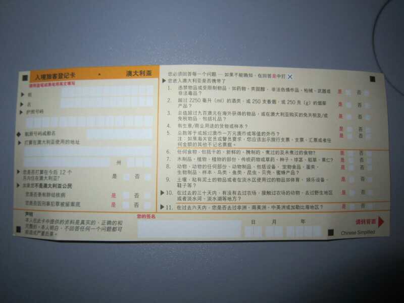 国际飞澳洲航班上会派入境淡黄色的卡卡!有中英文的你可以跟空姐拿中文的填写,记得选择是否是用叉叉“X”勾选的。