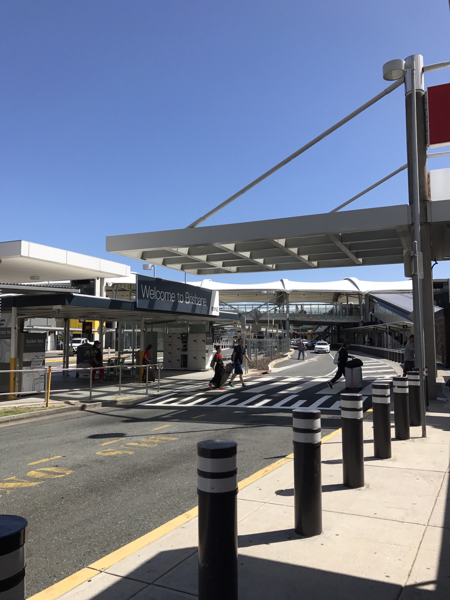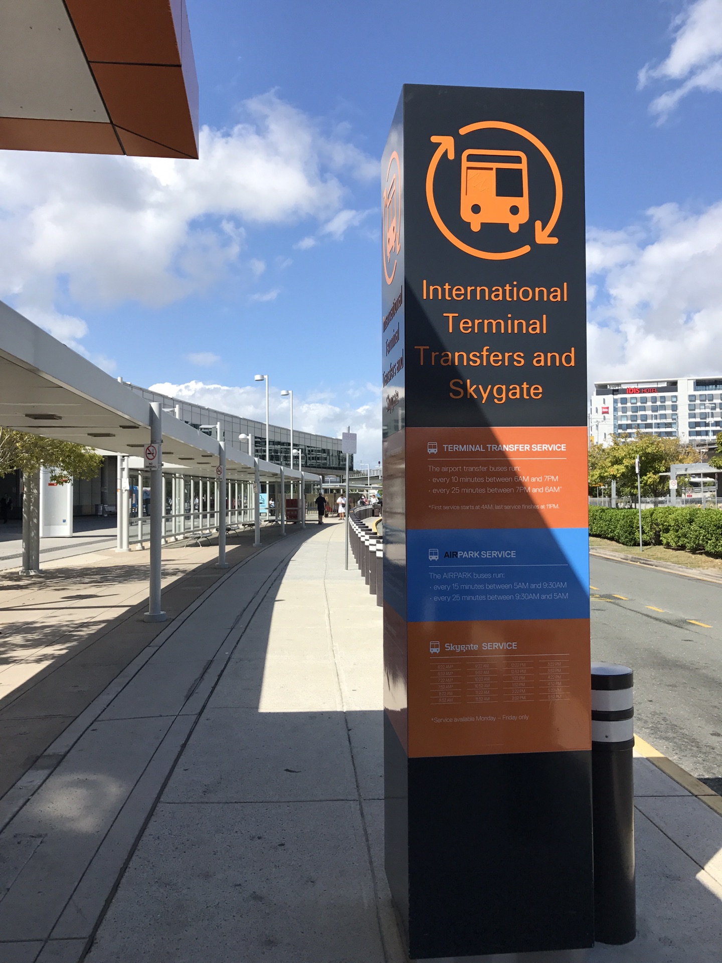 布里斯班的机场从国内到达大厅到国际到达大厅是要乘坐机场的接驳巴士的噢,可以在游客中心问在哪里坐车,但其实走出机场看到类似公交站台的地方就是了噢(下图那个标识柱子)。