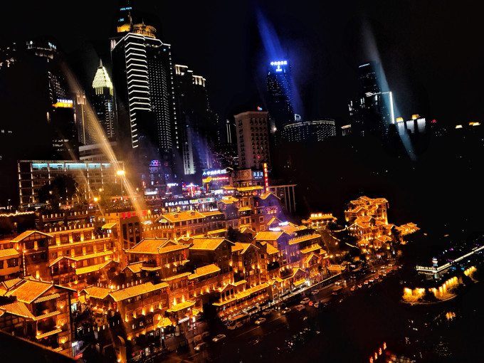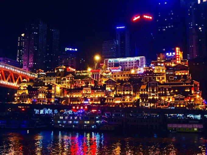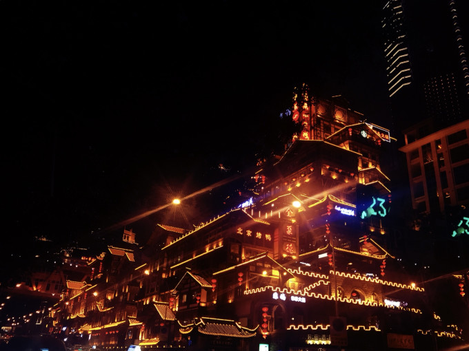 有一个观洪崖洞夜景的好地方,嘉陵江对岸的江北嘴大剧院。找一条小路下到江滩边,迎接江风的拍打,遥望绚丽斑斓的洪崖洞全景,于静默中将自己代入,感受宫崎骏的世界。