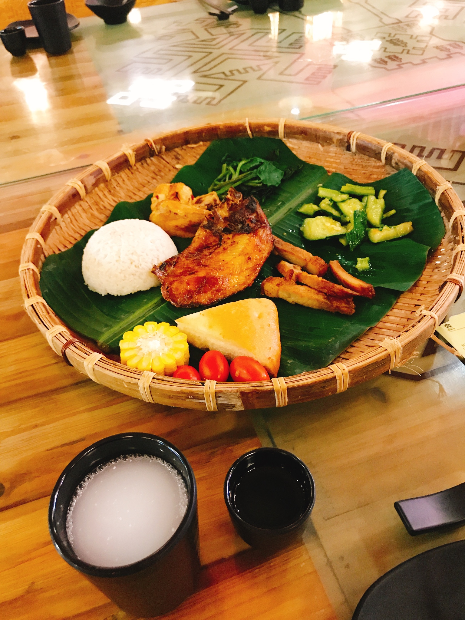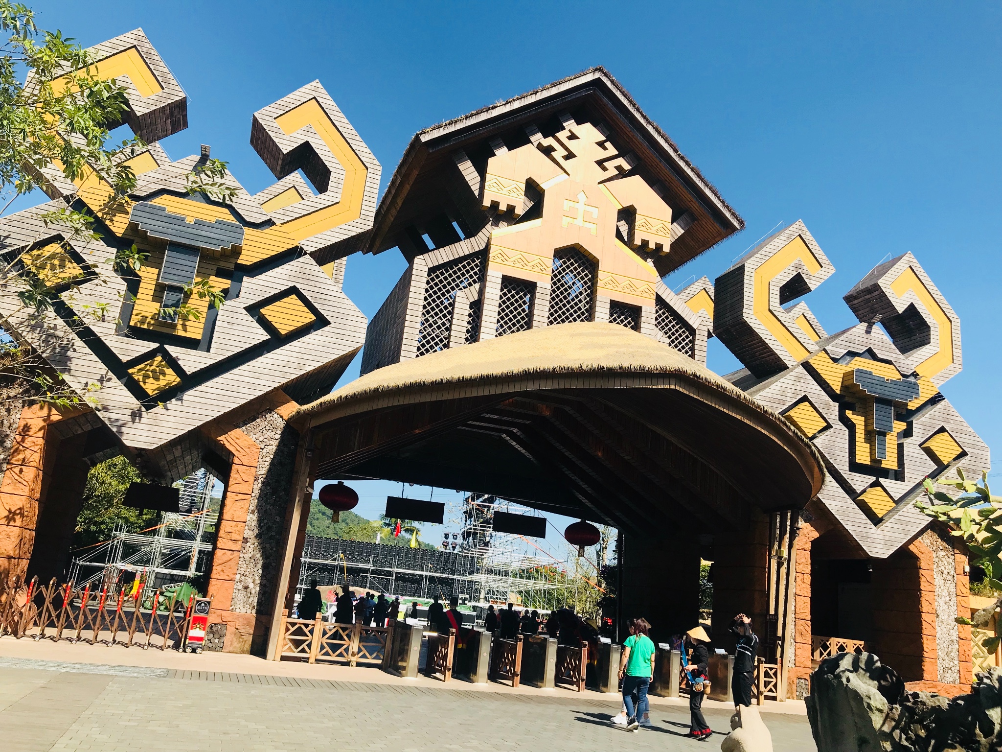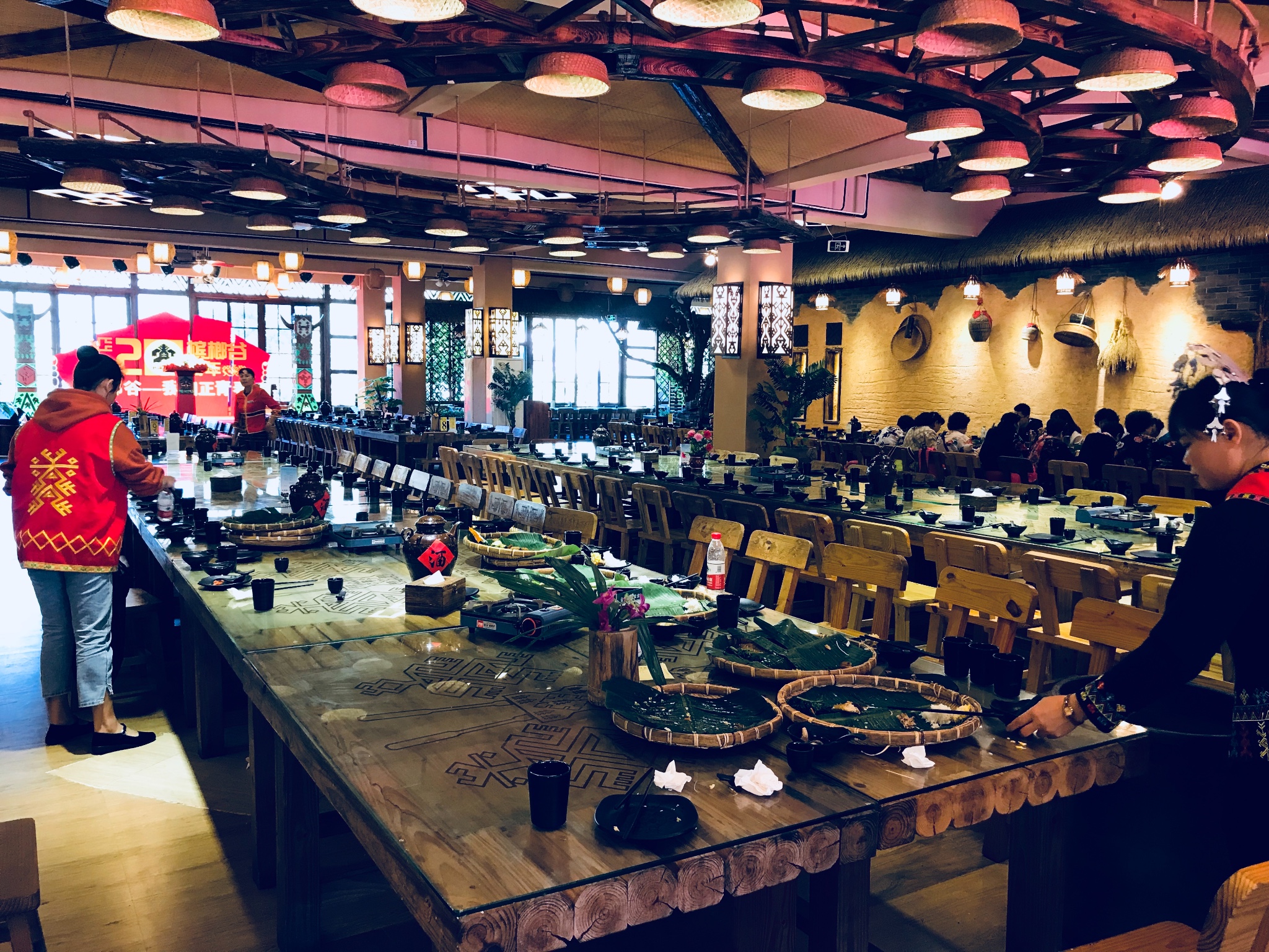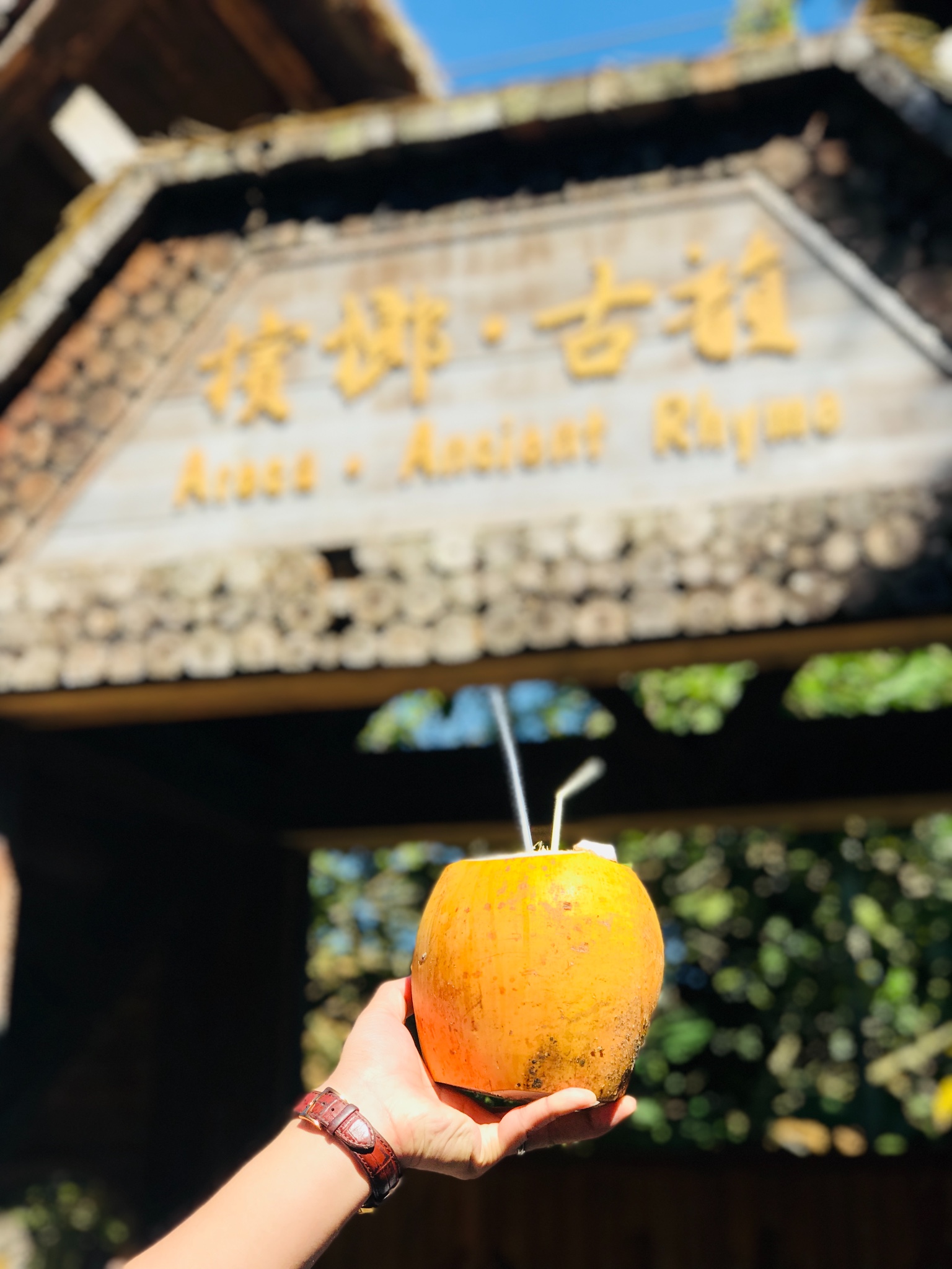 4、早上吃过早饭后来到了另一个有特色的打卡景区《槟榔谷》,我们是提前一天在网上买的通票含(门票+观光车+簸箕饭+《槟榔·古韵》歌舞表演,票价502元2人,到那大概是12点,可以直接去吃饭,午饭是黎族的特色簸箕饭,在一个长条桌和陌生人拼桌那种,一个人一簸箕,还有椰汁和米酒。有着名族服饰的阿妹唱欢迎歌曲和敬酒。吃过饭就可以出发去演出的地点了,景区有卖水果和烤肉的小摊,椰子有三种(普通青椰、黄金椰子、帝王椰)价格也是递增的,黄金椰可以唱一下,比青椰甜很多。《槟榔·古韵》讲述了黎族的生活习俗,地方文化等,表演相对很震撼,值得一看。景区风景很好,可以拍照,还有黎族的老奶奶在现场编织地毯。