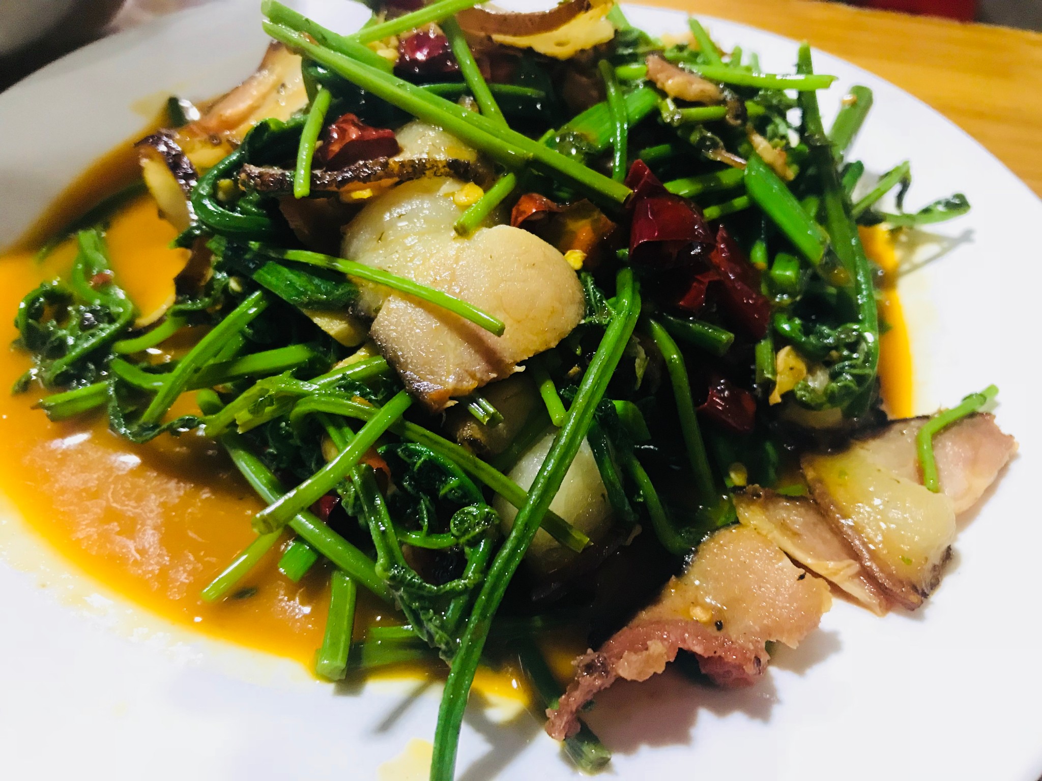荔波最有名的就是杨梅汤,美食街上几乎每家都有卖,另外就是贵州特色的腊肉、酸肉还有各种野菜之类的。不过除了腊肉,其他都欣赏不能。。。腊肉用辣椒、西红柿配合一些菜炒出来,可以说是下饭神器了~