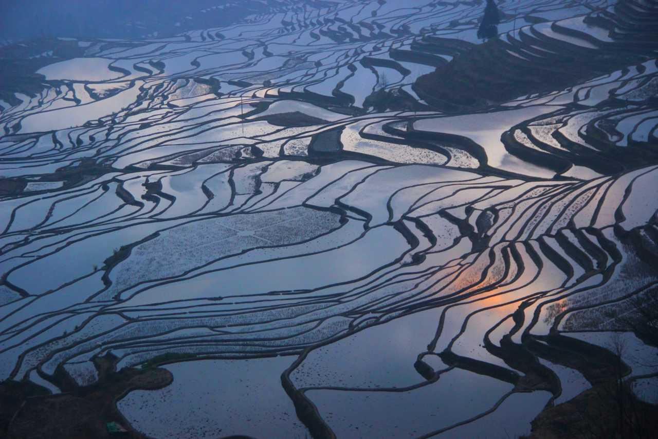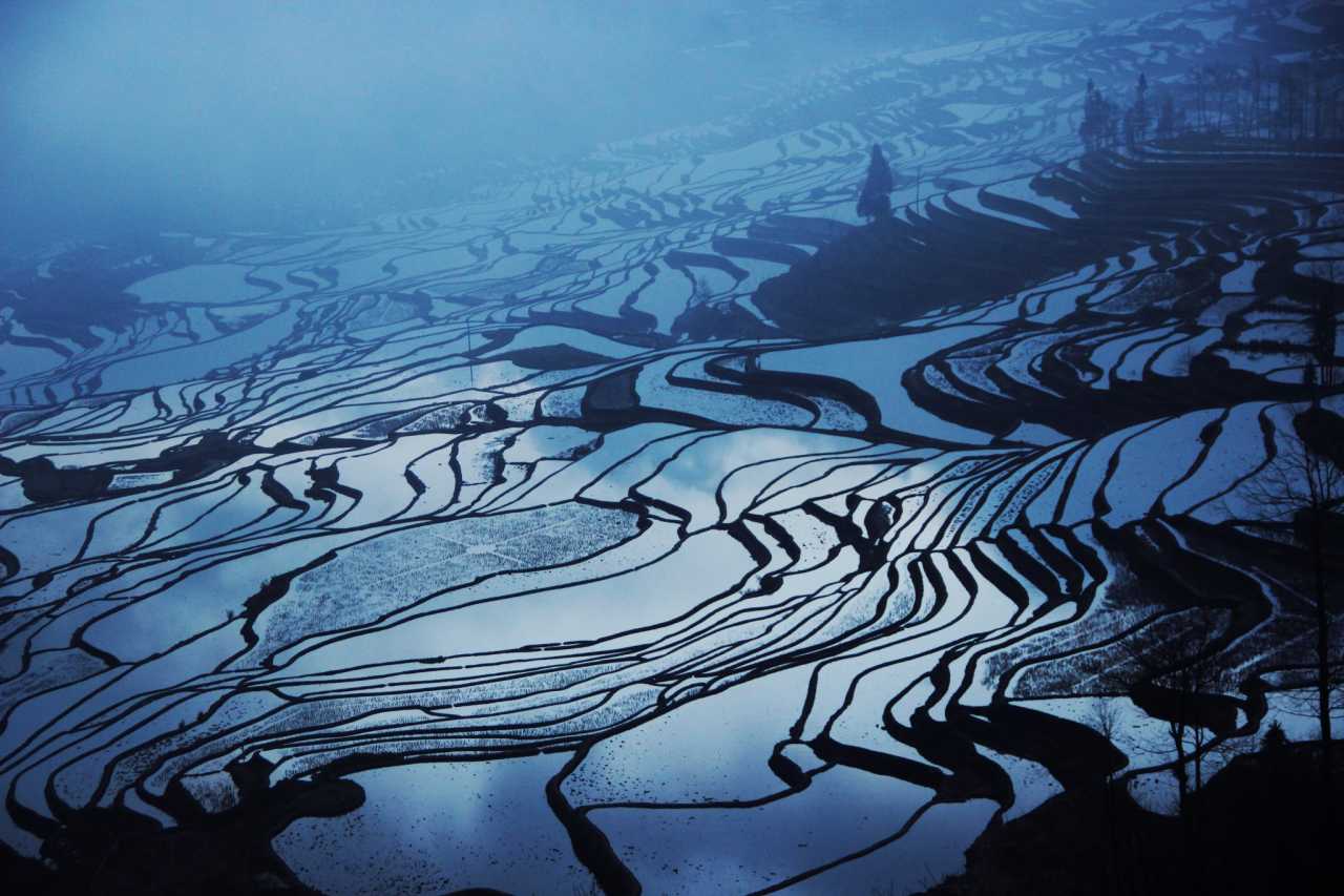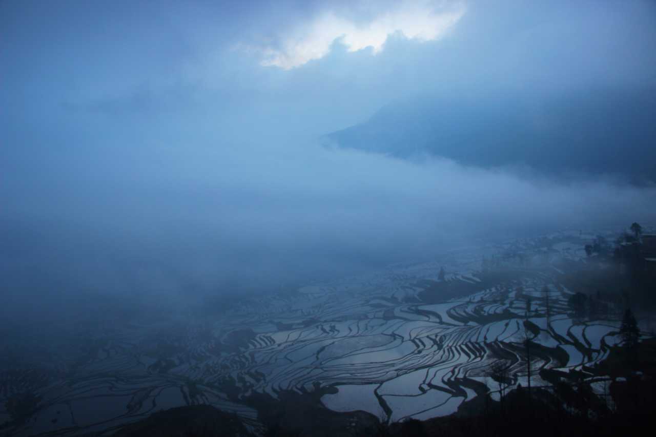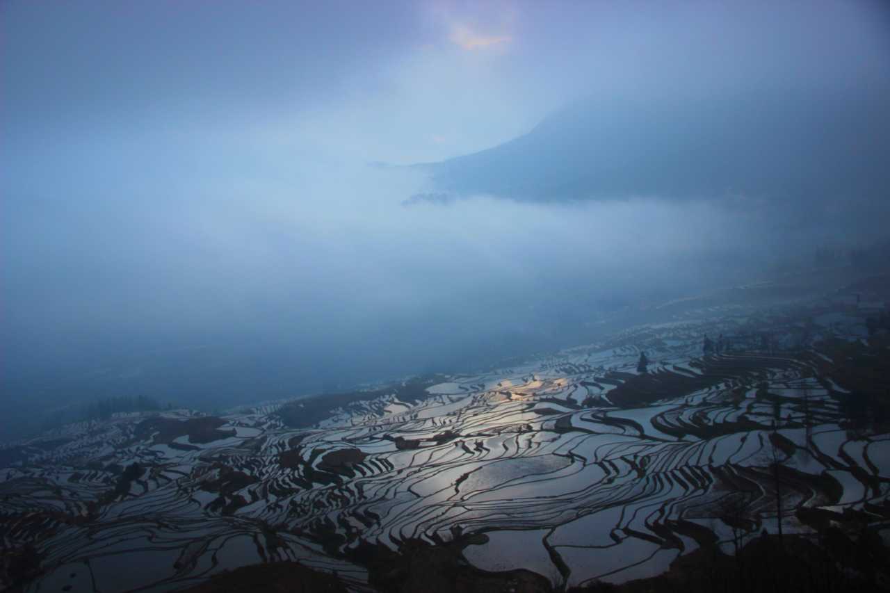 云雾慢慢的消散,墨色还正浓,浸染了梯田的水
