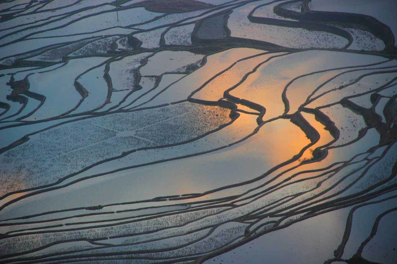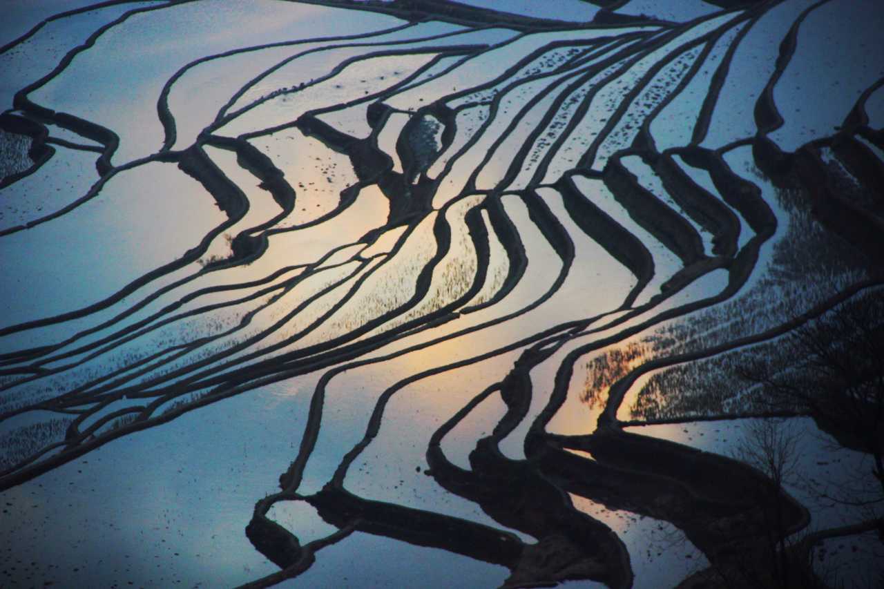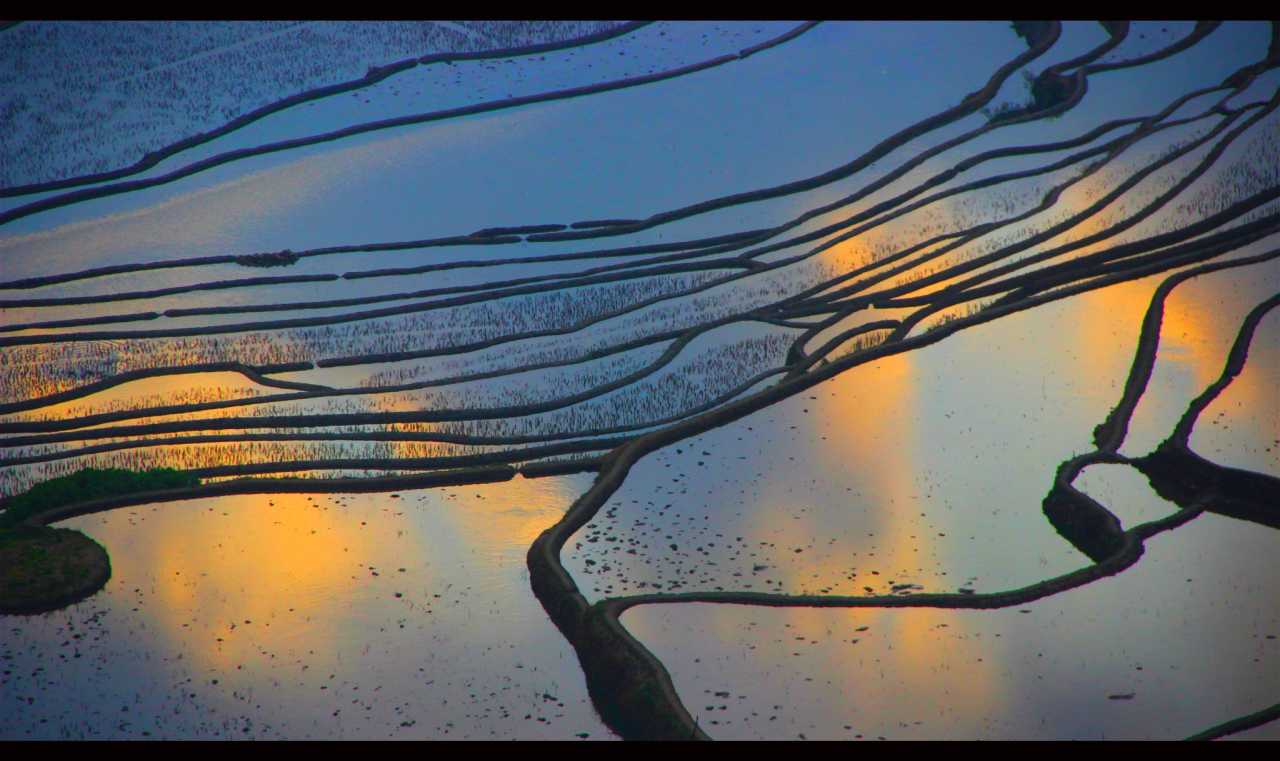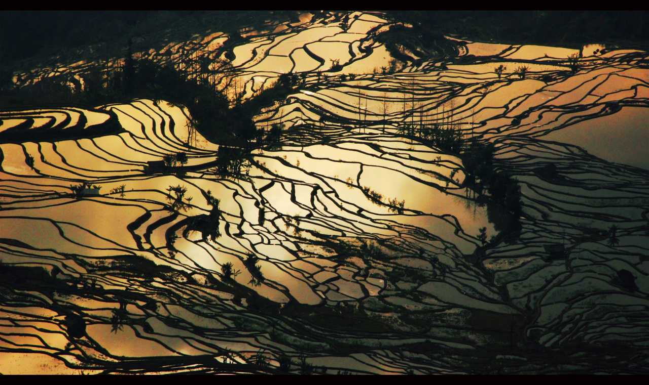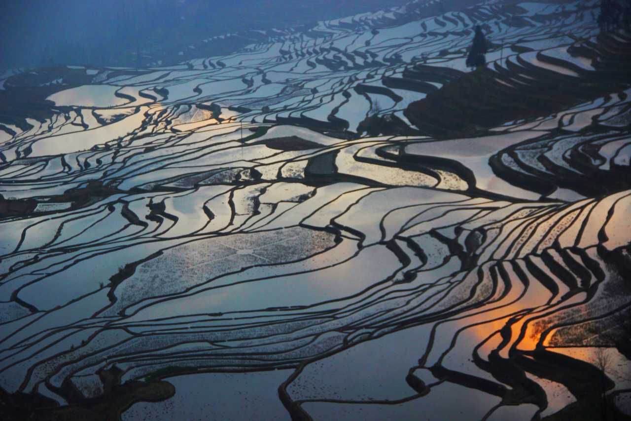 云雾慢慢的消散,墨色还正浓,浸染了梯田的水
