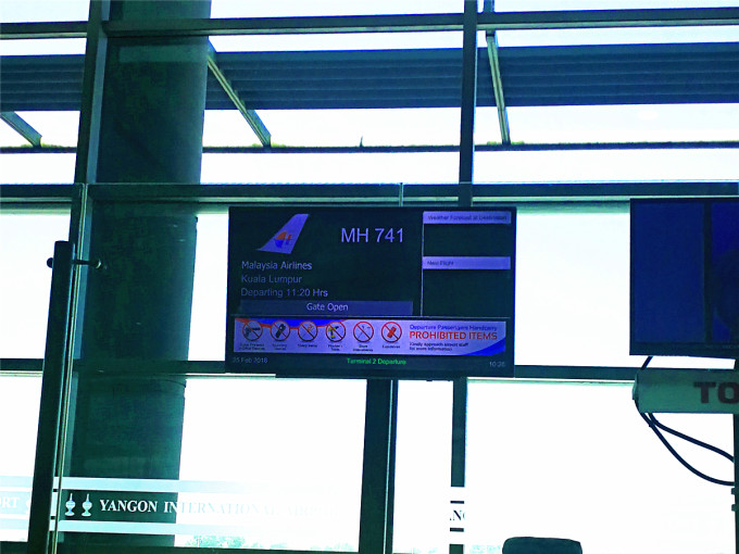 早上6点到仰光→打车去机场(大巴下车的地方距离机场打车30分钟,如果从市区去机场尽量为打车预留1.5小时以上,仰光市区堵车严重)→9点半到马航柜台办理值机→11:15坐马航(MH741)去吉隆坡→当地时间15:40到吉隆坡机场,不入境→17:05坐马航到南京(MH532)→22:30到南京禄口机场→坐机场大巴回家