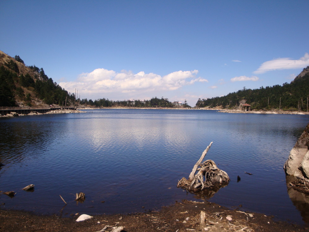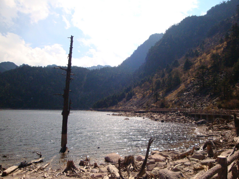 俯瞰黑龙潭,刚好风嗖嗖的吹,湖面上吹开波浪。