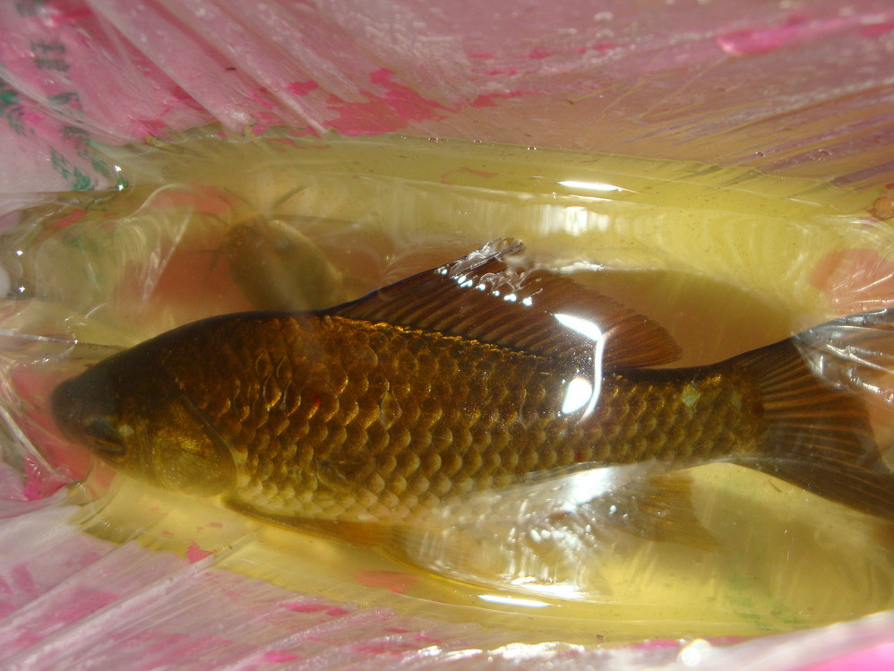 孩子自己第一次钓到两条鱼。