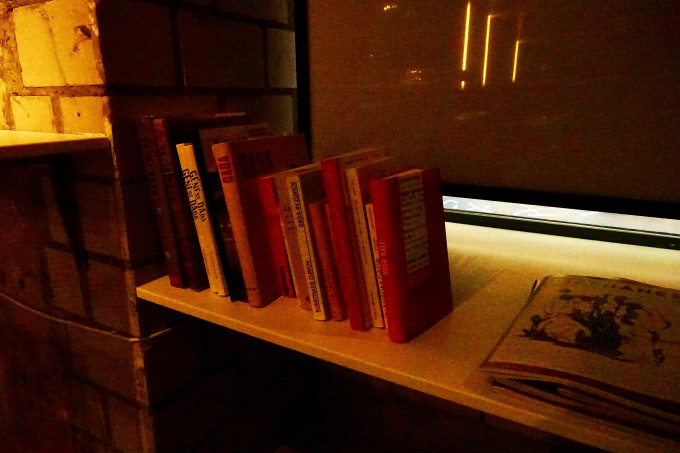 靠街道的桌子上立着和达达主义相关的杂志,书籍。