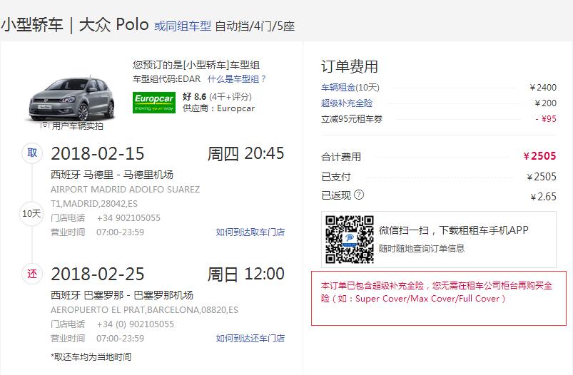 加上事先预付的租车+保险2505元