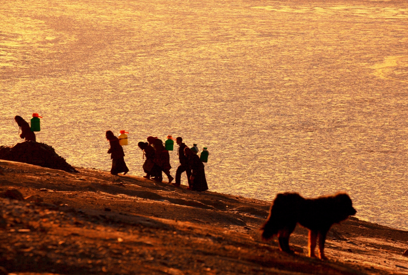 冬天的推瓦村是没有自来水的,水管已经全部被冻住了,吃水全靠村里的妇女从湖里背上来。