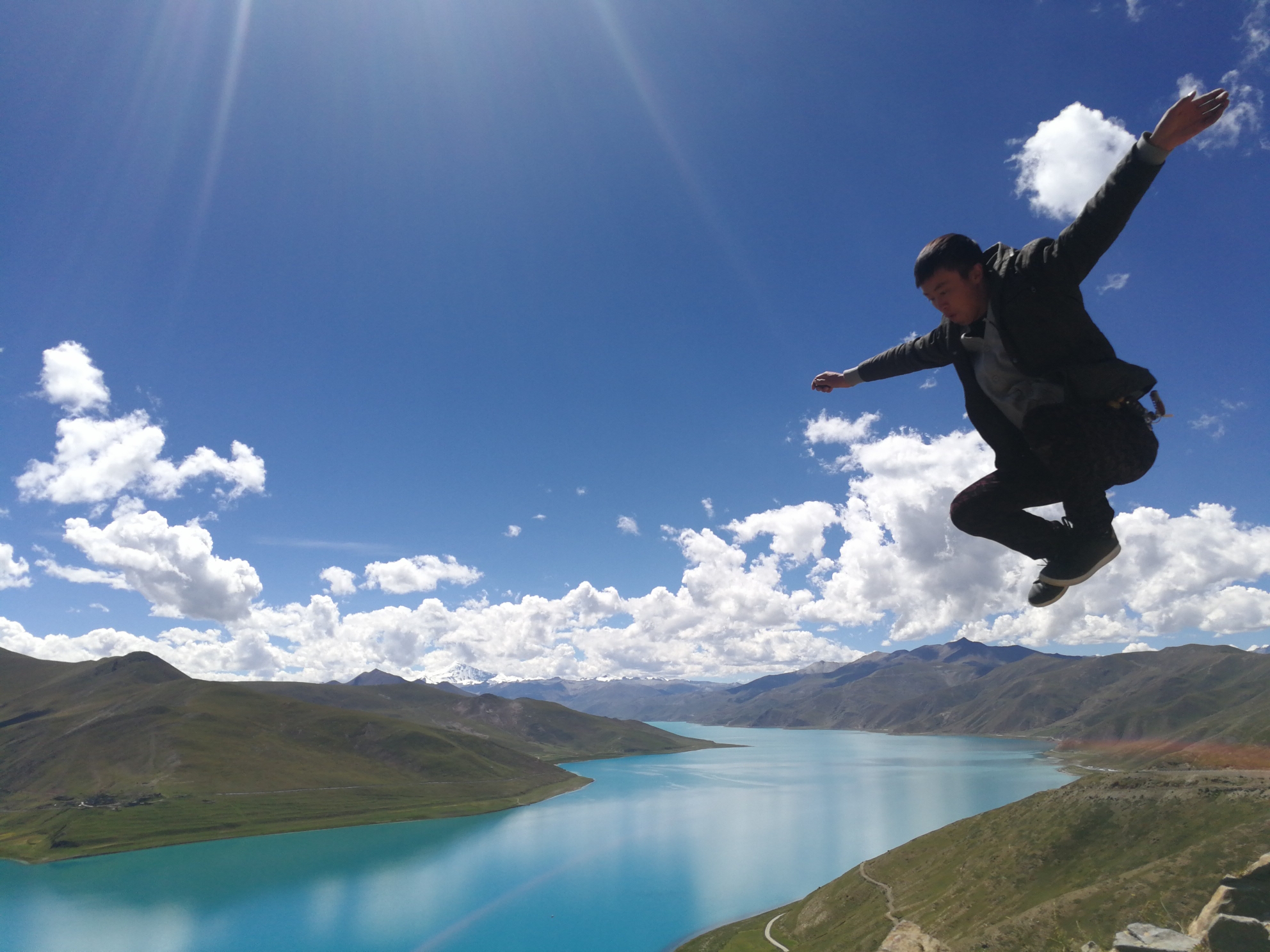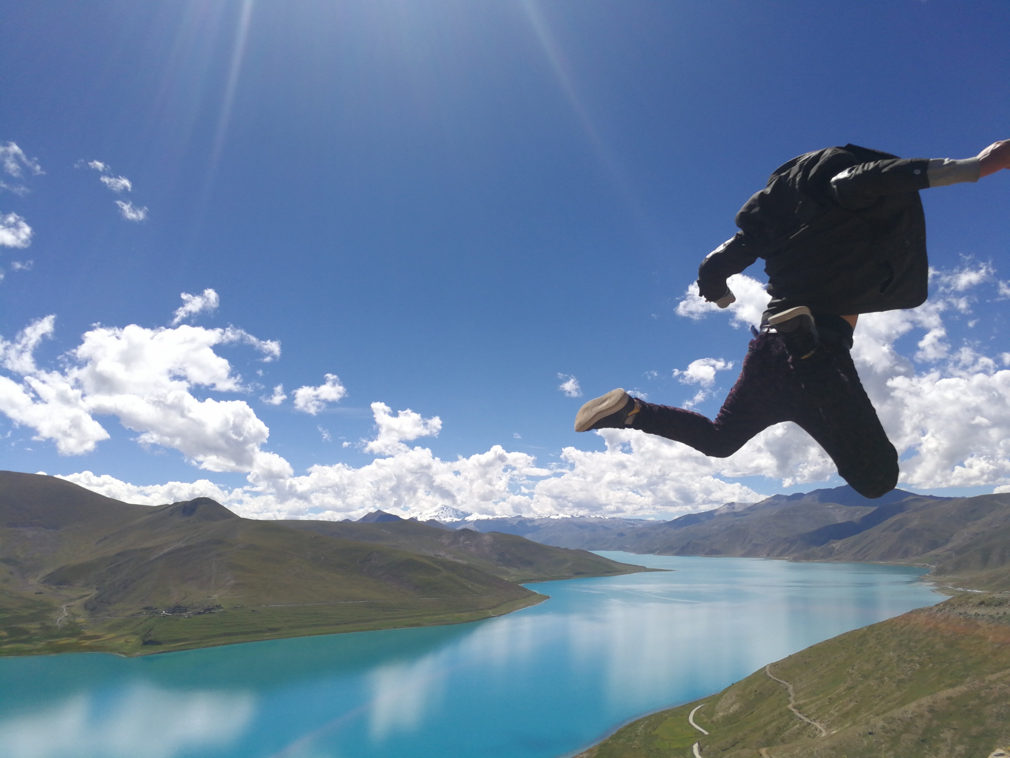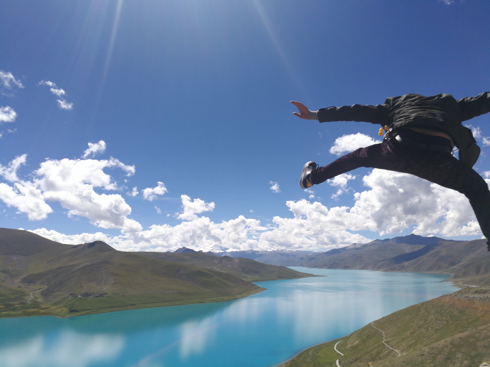 抑制不住内心的激动,就在羊湖观景台上跳了起来。
