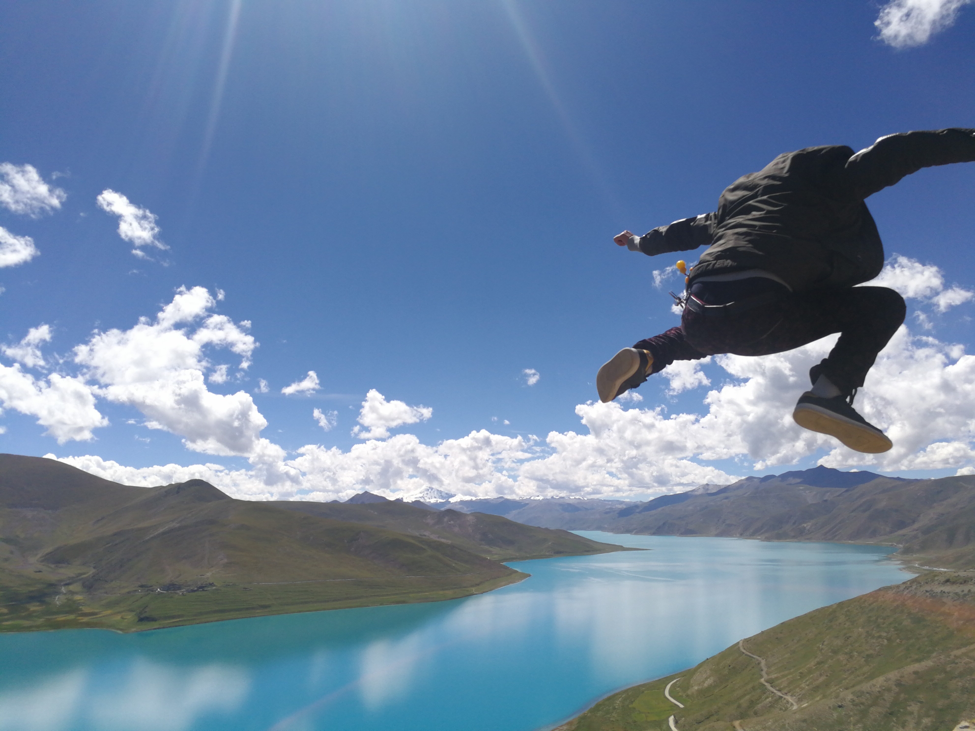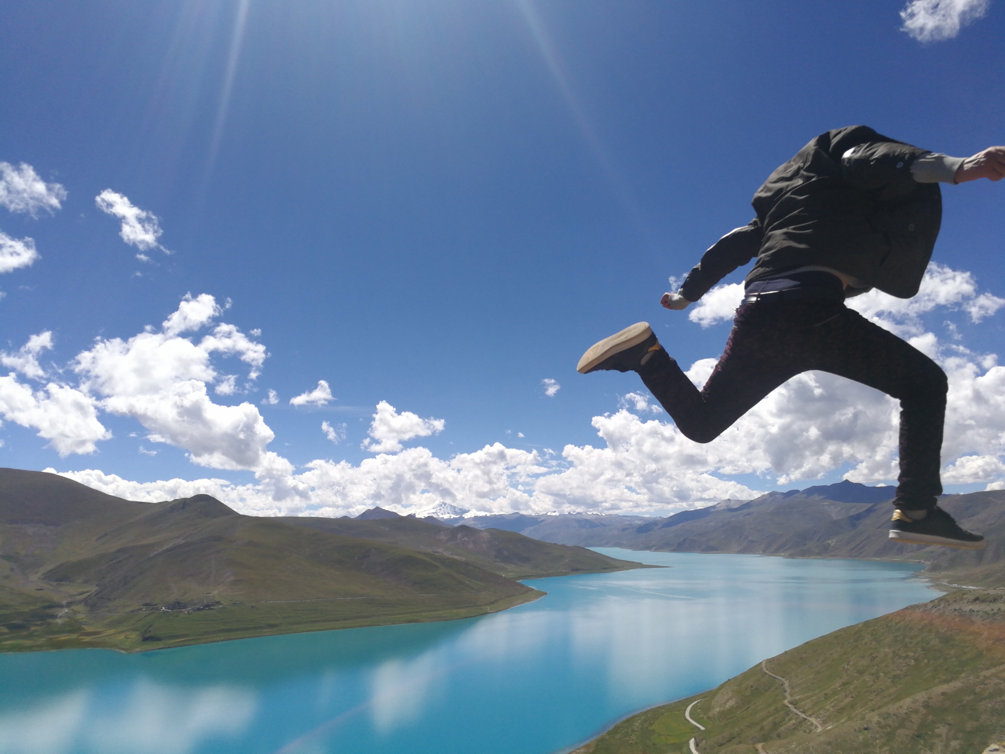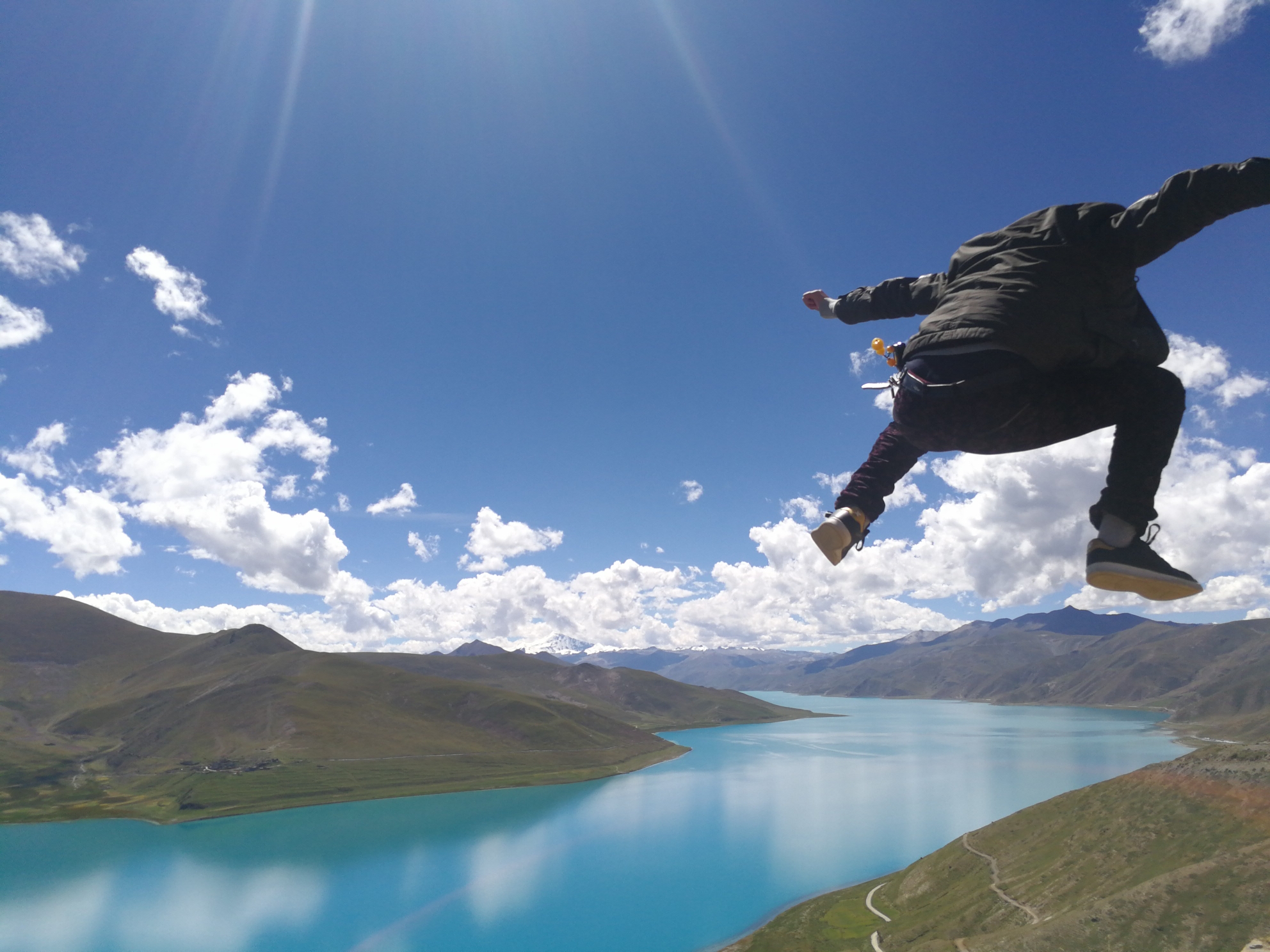 抑制不住内心的激动,就在羊湖观景台上跳了起来。