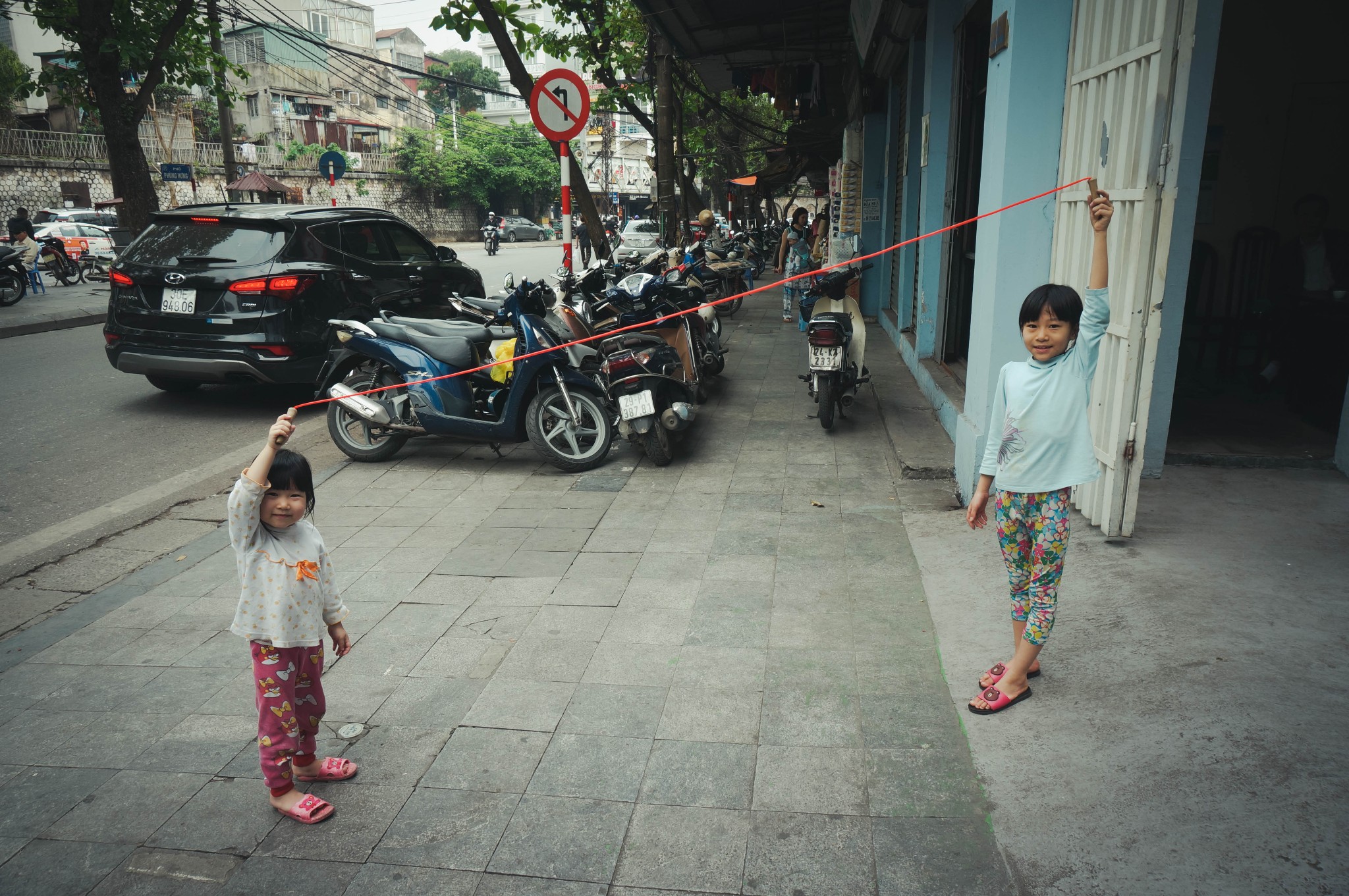 河内街边遇到正在玩耍的小朋友,像邻家小孩一样邀请我跟她们一起玩耍。