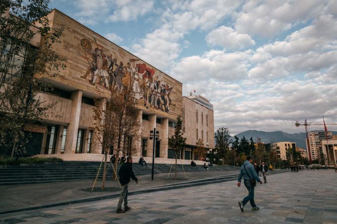 而在广场不远的历史博物馆门前,带有浓重的社会主义风格马赛克壁画横跨在天际,壁画上彰显着阿尔巴尼亚人民自信自强的姿态。