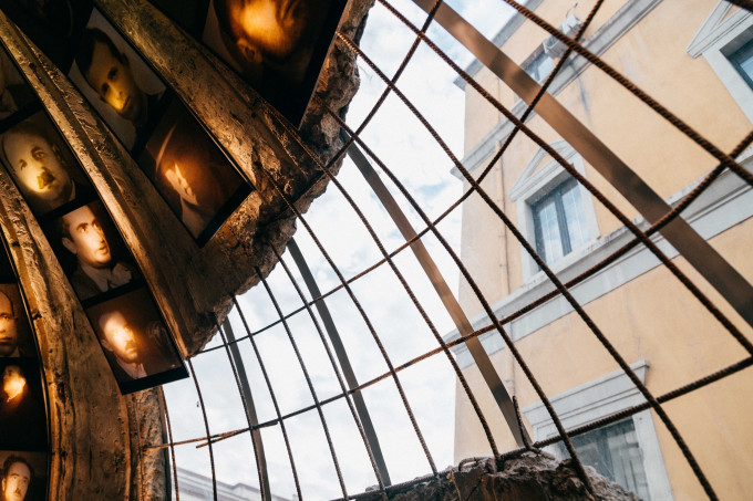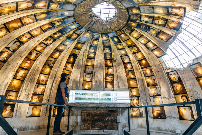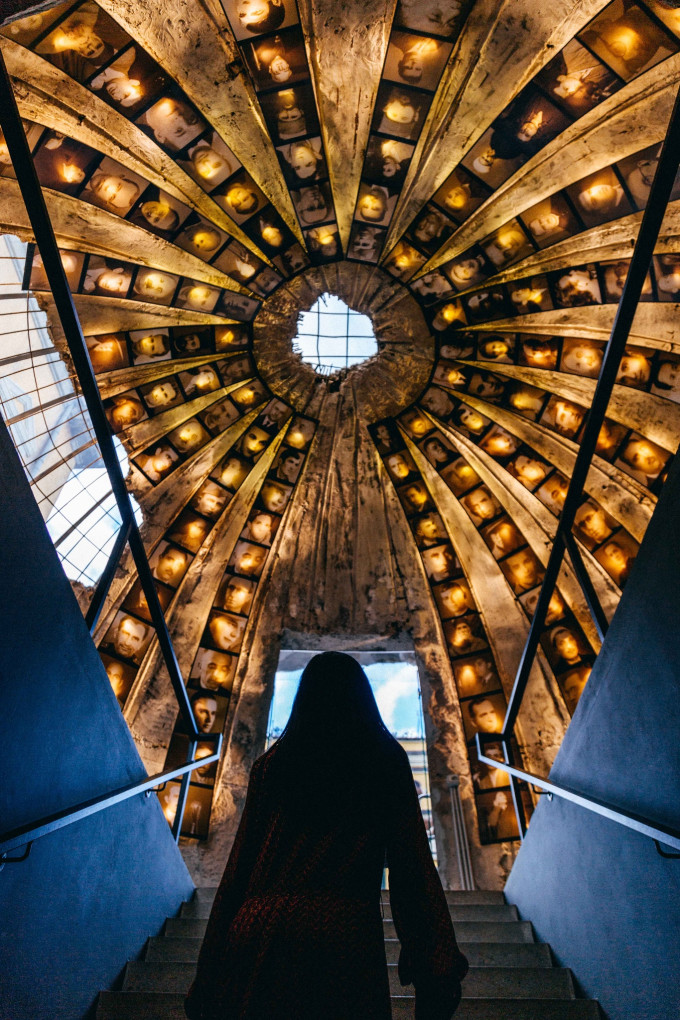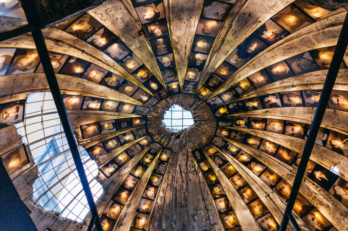 开口处变成了大门,一进到地堡发现别有洞天,头顶一条条像电影底片的画面一直通向顶部,仔细一看,原来每个图案都是一张人脸,原来纪念的是当时被迫害的人们。